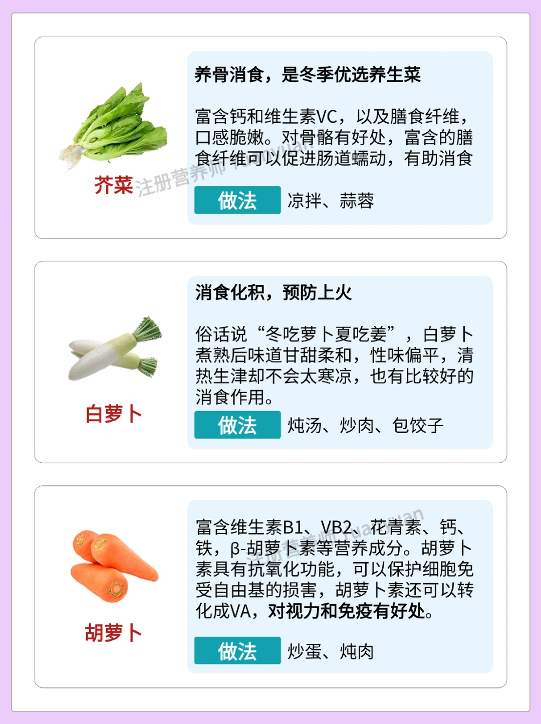 春耕夏耘,秋收冬藏。一年有四季,每个季节都有自己的应季蔬菜,蔬菜🍃的不同也体现了春夏秋冬的变换。 . 不时不食,顺时而食,讲究的是我们的饮食要符合时令节气的规律, 春生、夏长、秋收、冬藏,顺应自然,天时地利,才能做到膳食养生,调补身体。 . 冬天寒冷干燥,我们更容易感到疲劳乏力,为了增加活力,保持健康,饮食选择特别重要。由于温度的原因,肉类更容易让人无法抗拒,但有些冬季应季养生蔬菜能给我们带来更多的好处,一起来看一下适合冬天吃的应季蔬菜👆~