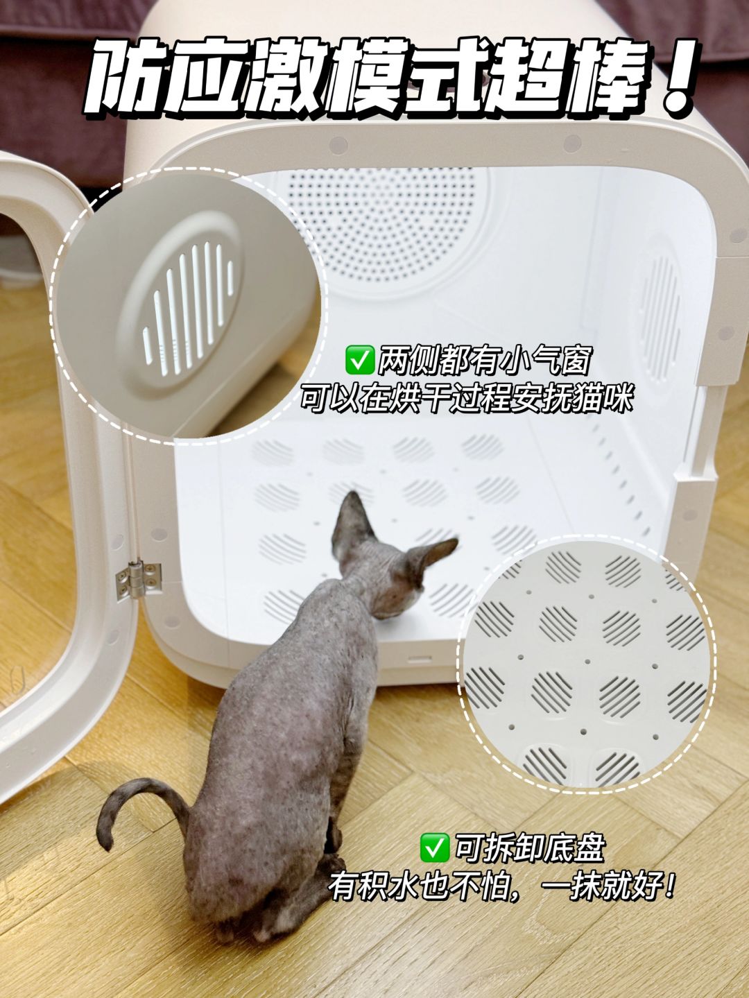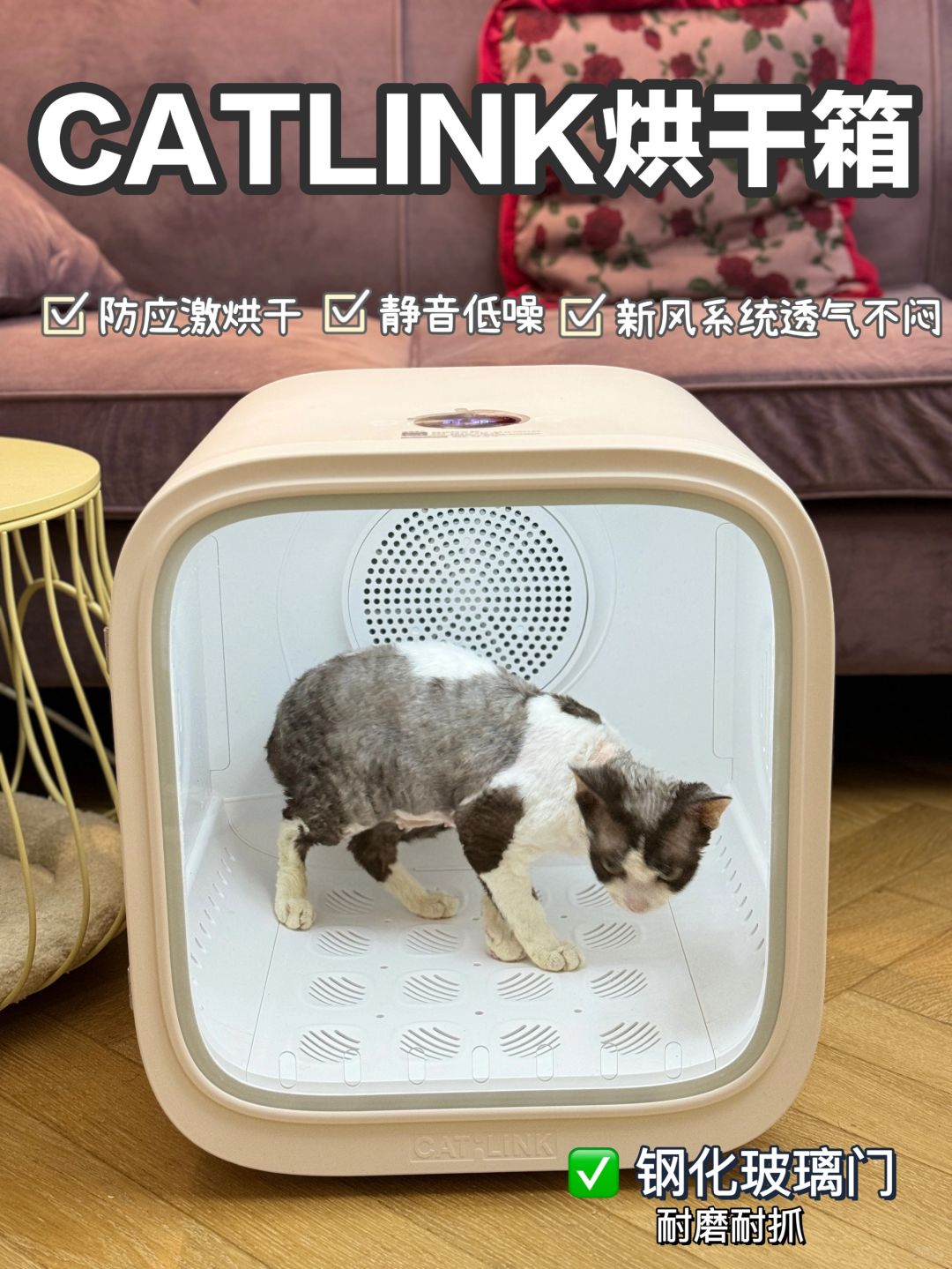 CATLINK烘干箱,它的防应激模式真的太适合毛孩子了,打开以后一开始吹毛就是没有风噪的📌,声音只有40分贝,因为这个我家毛孩子很容易就适应了它。就算正常吹风也是从没有声音慢慢加上去,快速烘干也只有80分贝,比吹风机的声音还要小不少。