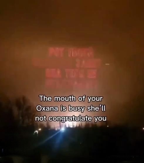 从画面看,俄军投影出了一男一女两位军官,然后是一些低俗画面,结尾写道:你们上司的嘴在忙着“不可描述”,她不会祝贺你们的。
