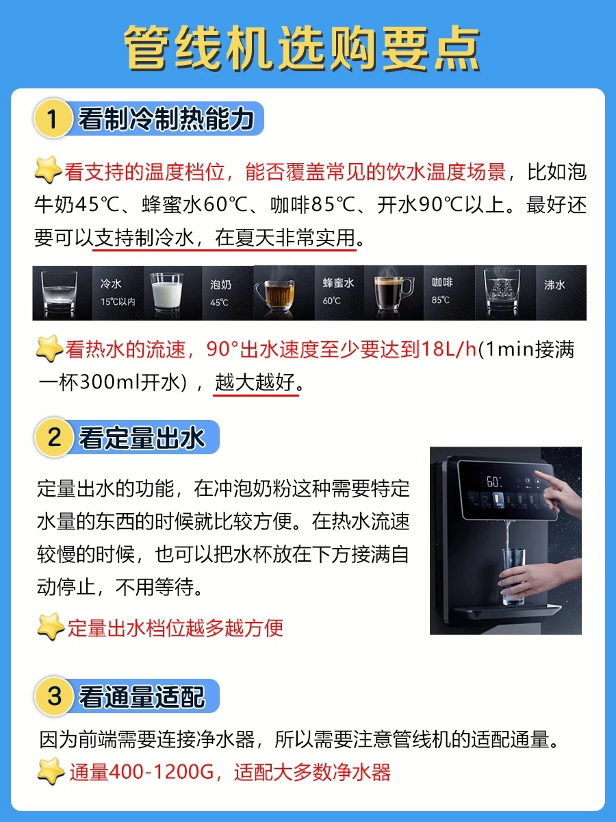 看支持的温度档位,能否覆盖常见的饮水温度场景,比如泡牛奶45℃、蜂蜜水60℃、咖啡85℃、开水90℃以上。👍🏻最好还要可以支持制冷水,在夏天非常实用。