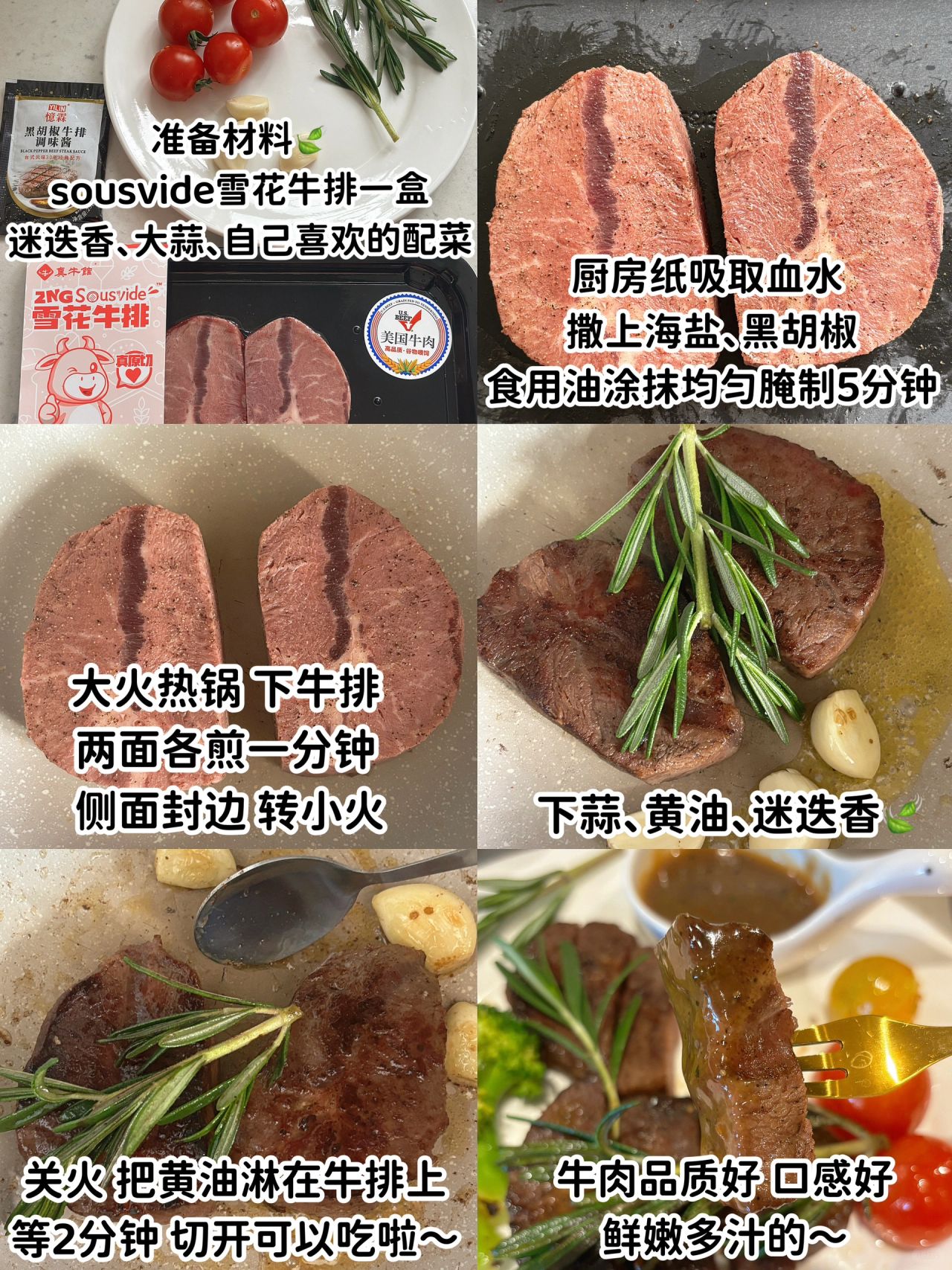 材料📒 sousvide雪花牛排一盒、迷迭香、大蒜、自己喜欢的配菜 做法🧑🍳 1️⃣牛排提前半小时泡水解冻 2️⃣厨房纸吸干牛排表面,撒上海盐黑胡椒,食用油涂抹均匀腌制5分钟 3️⃣大火热锅下牛排两面各煎一分钟 侧面封边转小火,下蒜、黄油、迷迭香 4️⃣关火把黄油淋在牛排上,等2分钟醒肉,切开可以吃啦~ 居家过圣诞也很棒!主打一个温馨又有仪式感💐