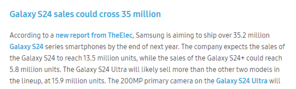[早报]三星S24系列详细销量目标曝光:三星S24 Ultra或达1590万!据悉,三星的目标是到明年年底,三星S24系列手机的出货量超过3520万部。其中,预计三星S24的销量将达到1350万部,而