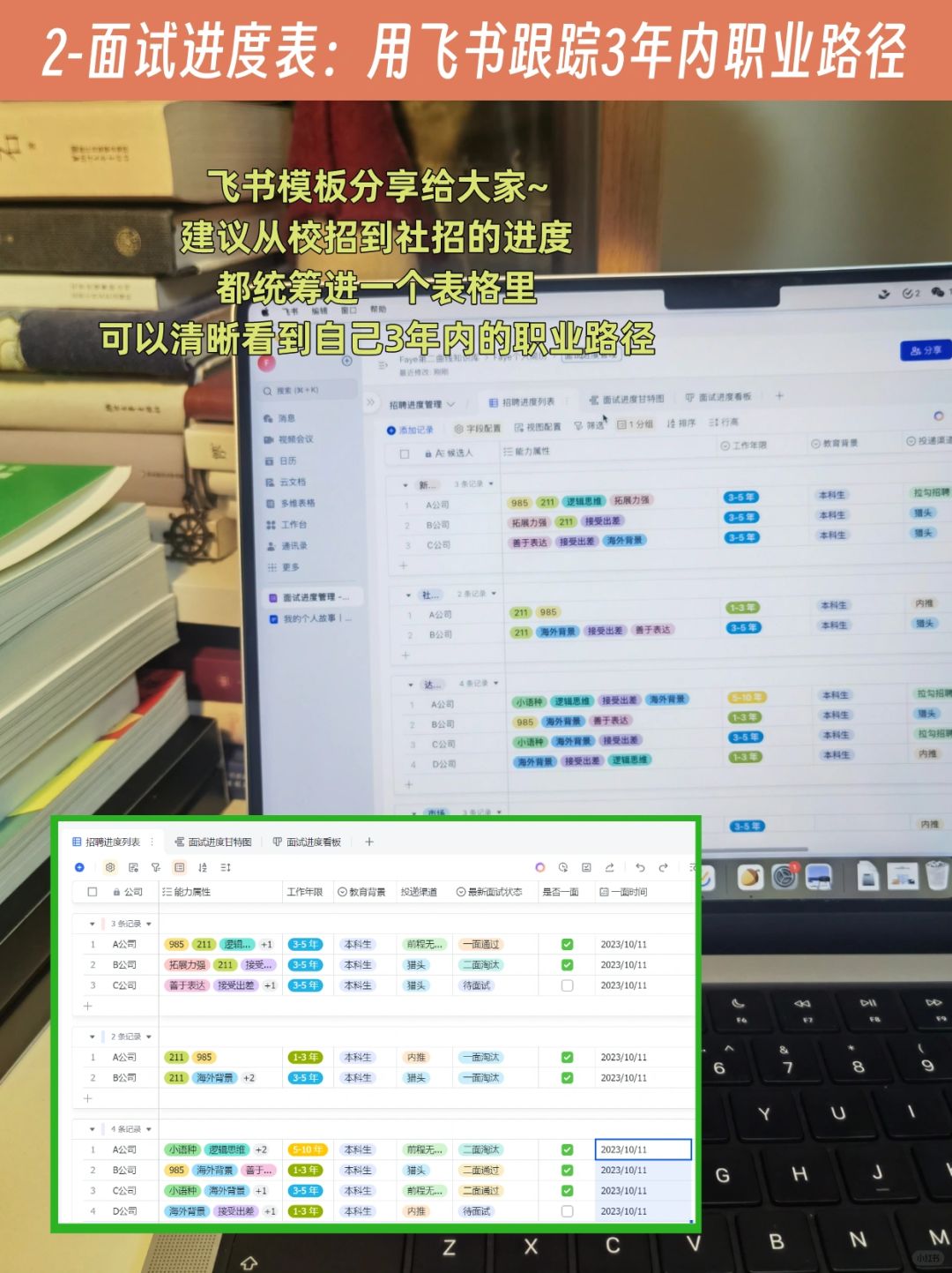 建议从校招到社招的求职进度,都统筹进一个表格里,可以清晰看到自己3年内的职业路径。