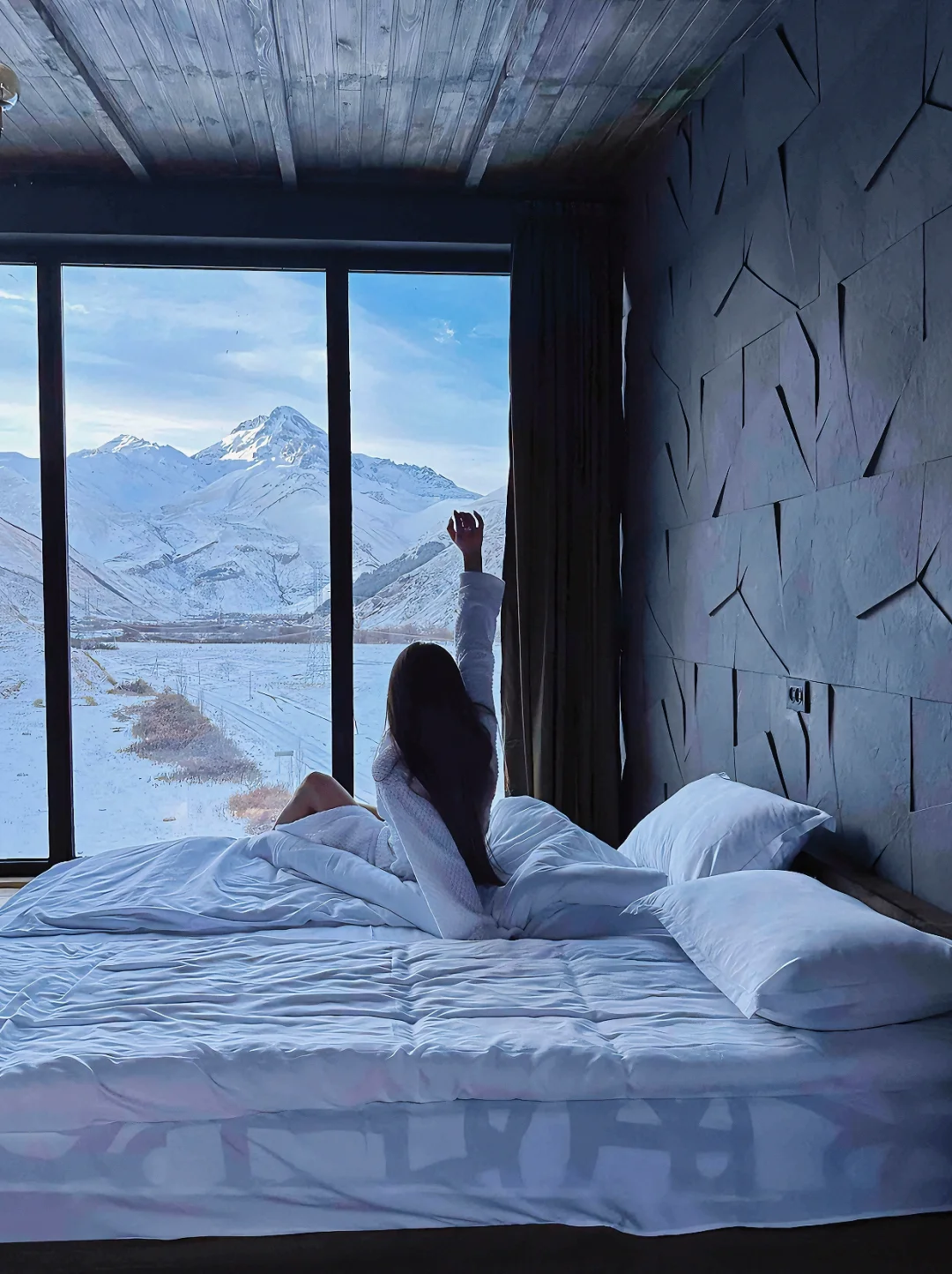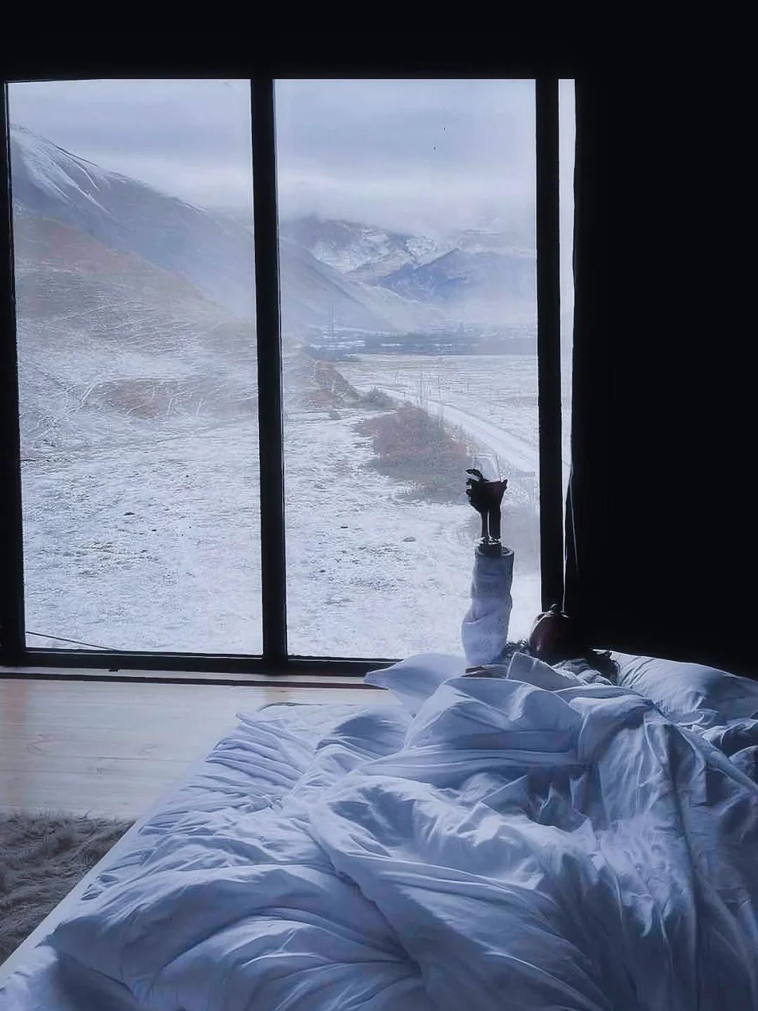 ▪️ 最美的莫过于卧室床边的大落地观景窗了,冬天美绝了,一觉醒来就能看见雪山