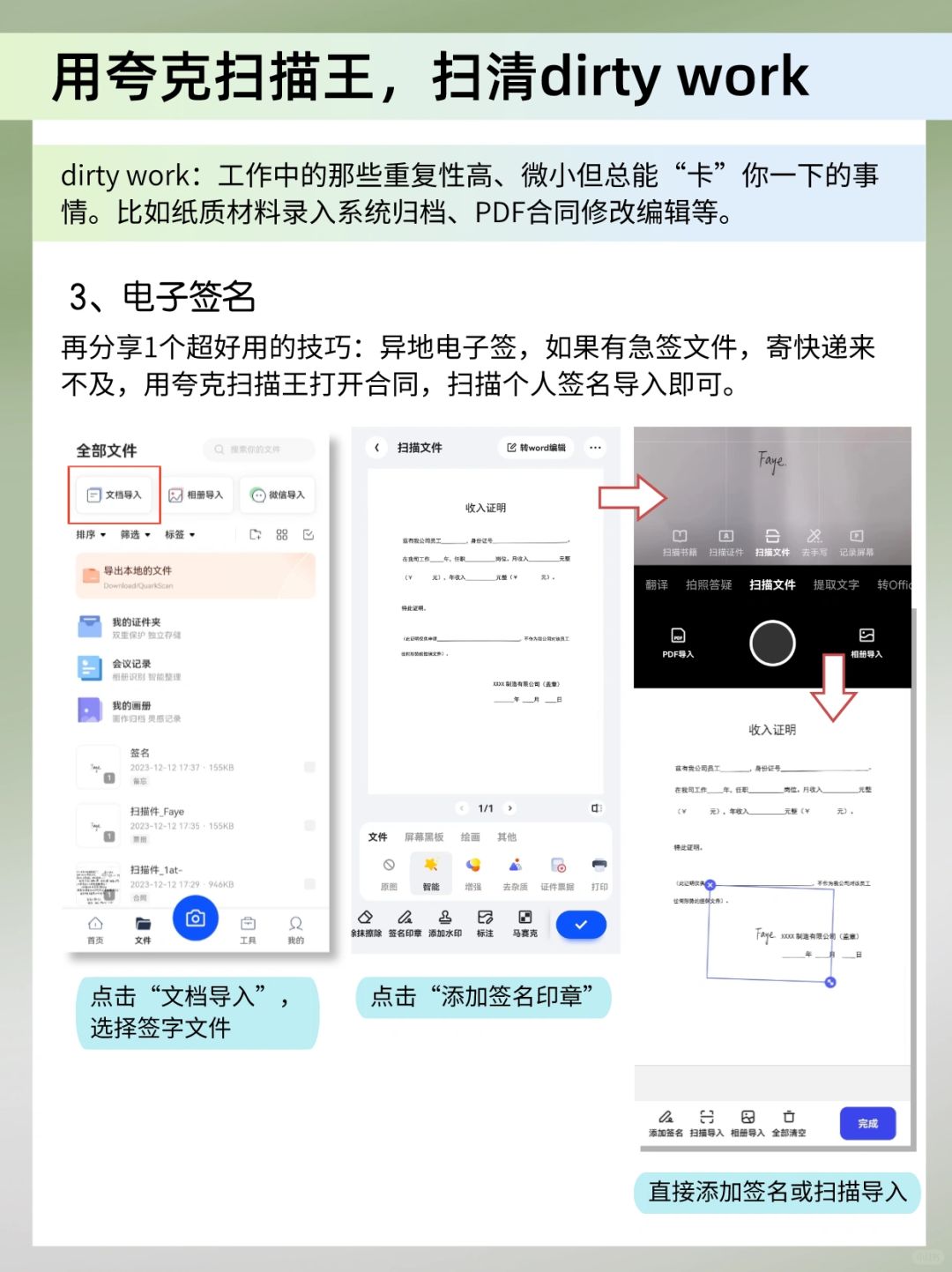 无论是自己还是对接人,如果异地出差有急签文件,寄快递来不及的情况,用夸克扫描王打开合同,扫描个人签名导入即可,和签纸质原件效果没差。