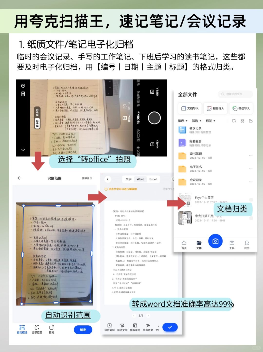 具体如何做呢:将所有的会议记录/手写工作笔记/采购单全都用多页模式扫描电子化存档,扫描后可转成word/excel在线编辑导出,纸质表格提取成excel可一键统计求和,还能一键去除手写笔迹,是全新的扫描体验。