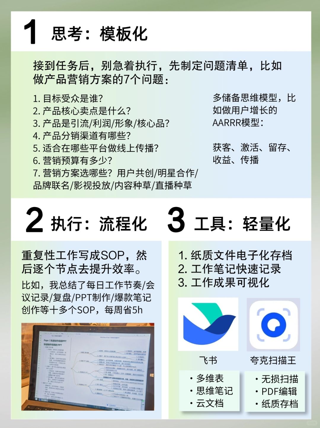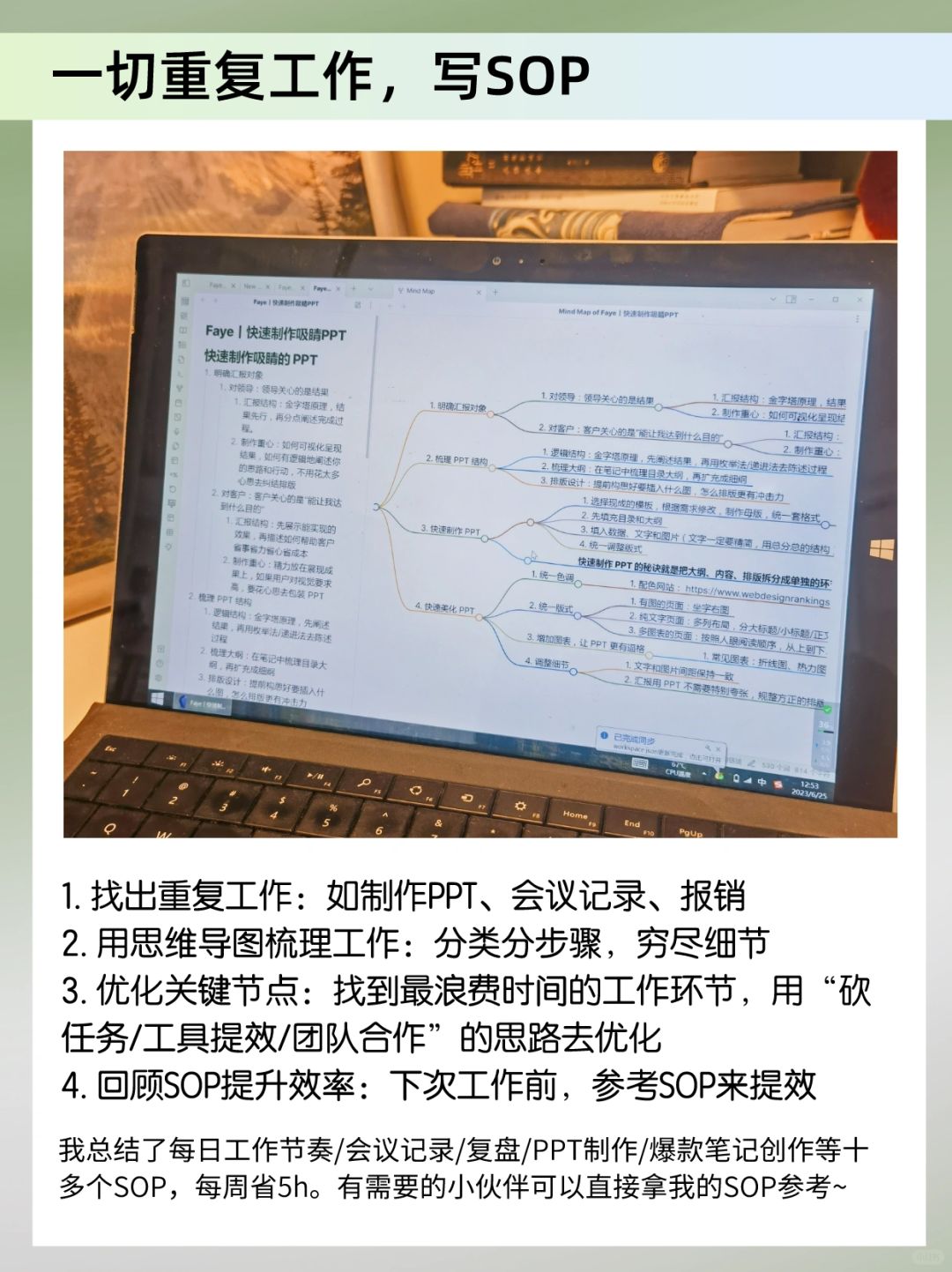 比如,我总结了每日工作节奏/会议记录/复盘/PPT制作/爆款笔记创作等十多个SOP,每周至少能省下5h用于自我提升。