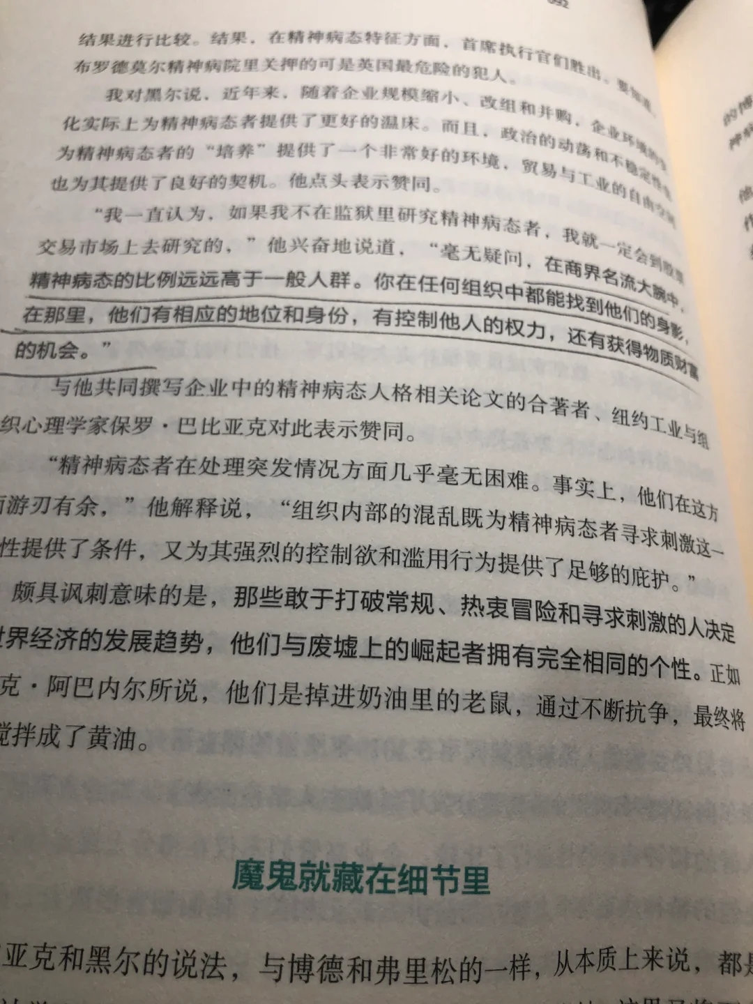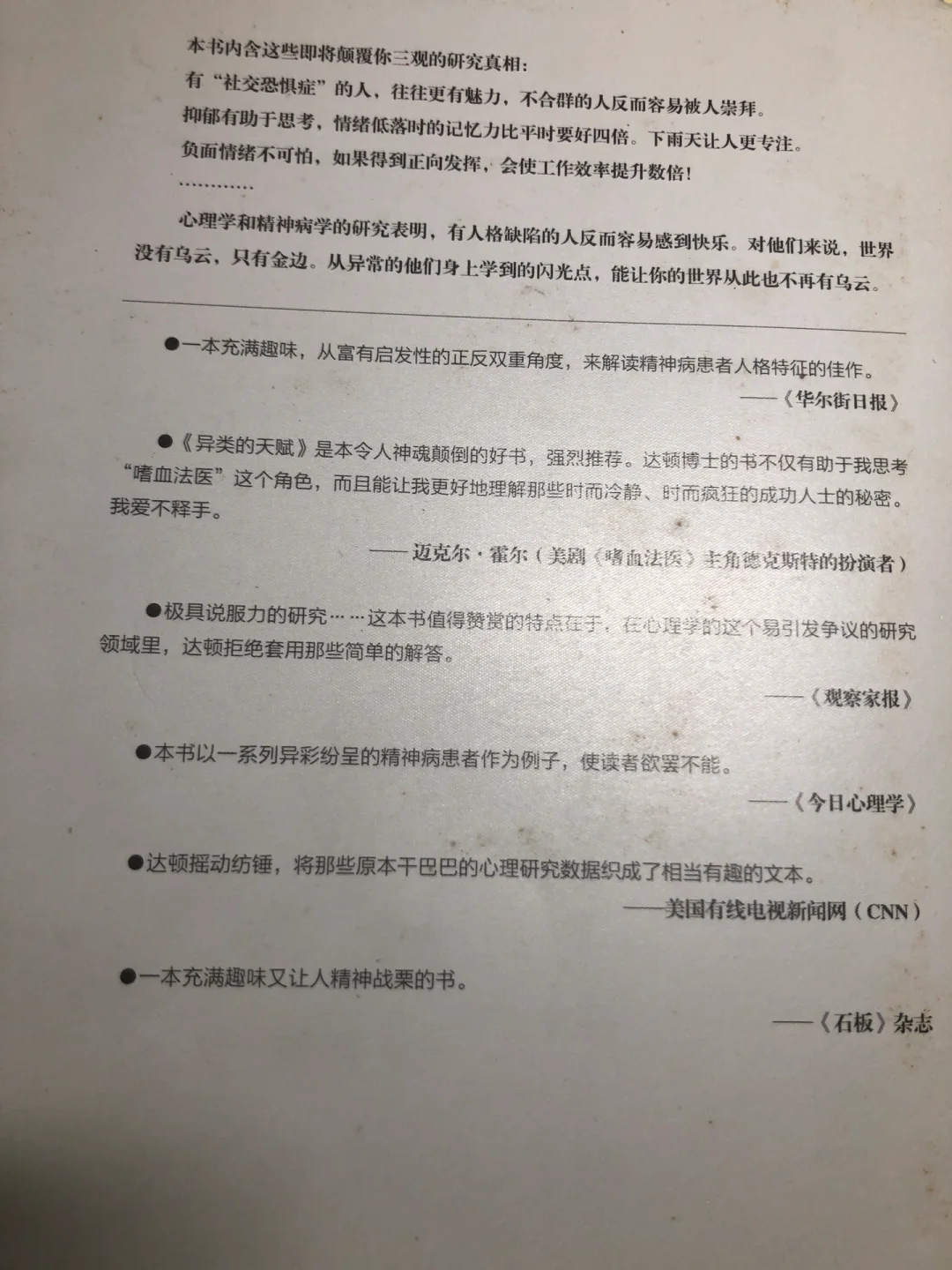 这本书的副标题是“天才、疯子和内向人格的成功密码”,但实际上不是这个意思,而实际上想表达的是精神变态或反社会人格障碍有助于世俗意义上的竞争与成功。” 成功与好人不可兼得。成功需要做出牺牲,毕竟慈不掌兵,义不掌财嘛。 成功者需要专注、无情、无畏、冷酷等。用李宗吾先生的话来说就是要懂得厚黑。 虽然这本书有点挂羊头卖狗肉,也有点杂乱不成体系,但还在核心观点不难懂,一个小时可以翻完。 为了成功,疯狂起来,走不想走的路!不必在乎旁边的冷言冷语。