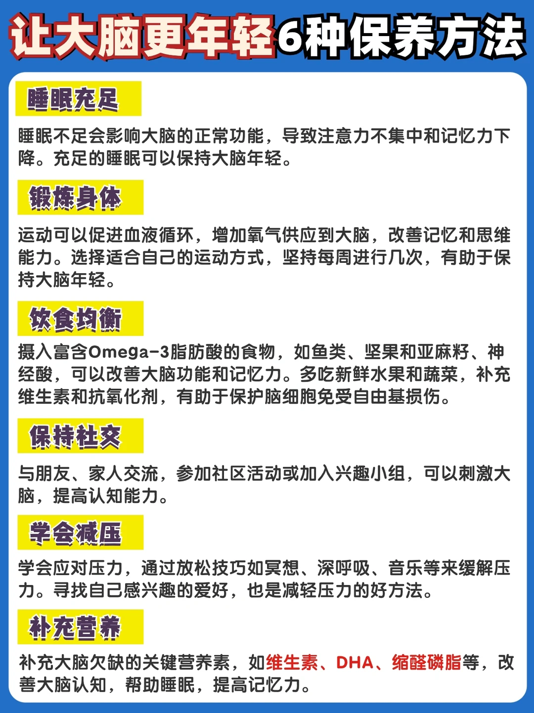 失眠?健忘?别惊慌,脑部保养攻略get!随着生活节奏的加快和工作ya力的增加,越来越多的人开始guan注脑部健康,保持大脑年轻和活跃不仅可以提高ji忆力和学xi能力,还能预防老年痴呆等脑部疾病的发生!这份脑保养攻略,收好~