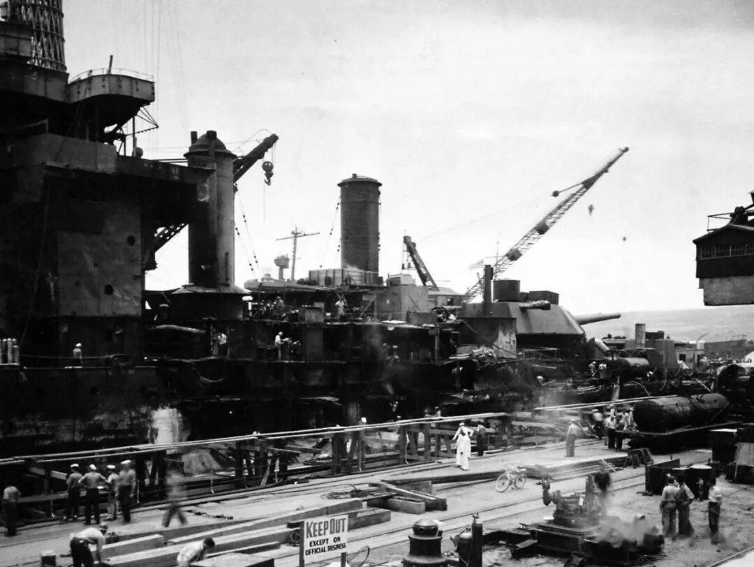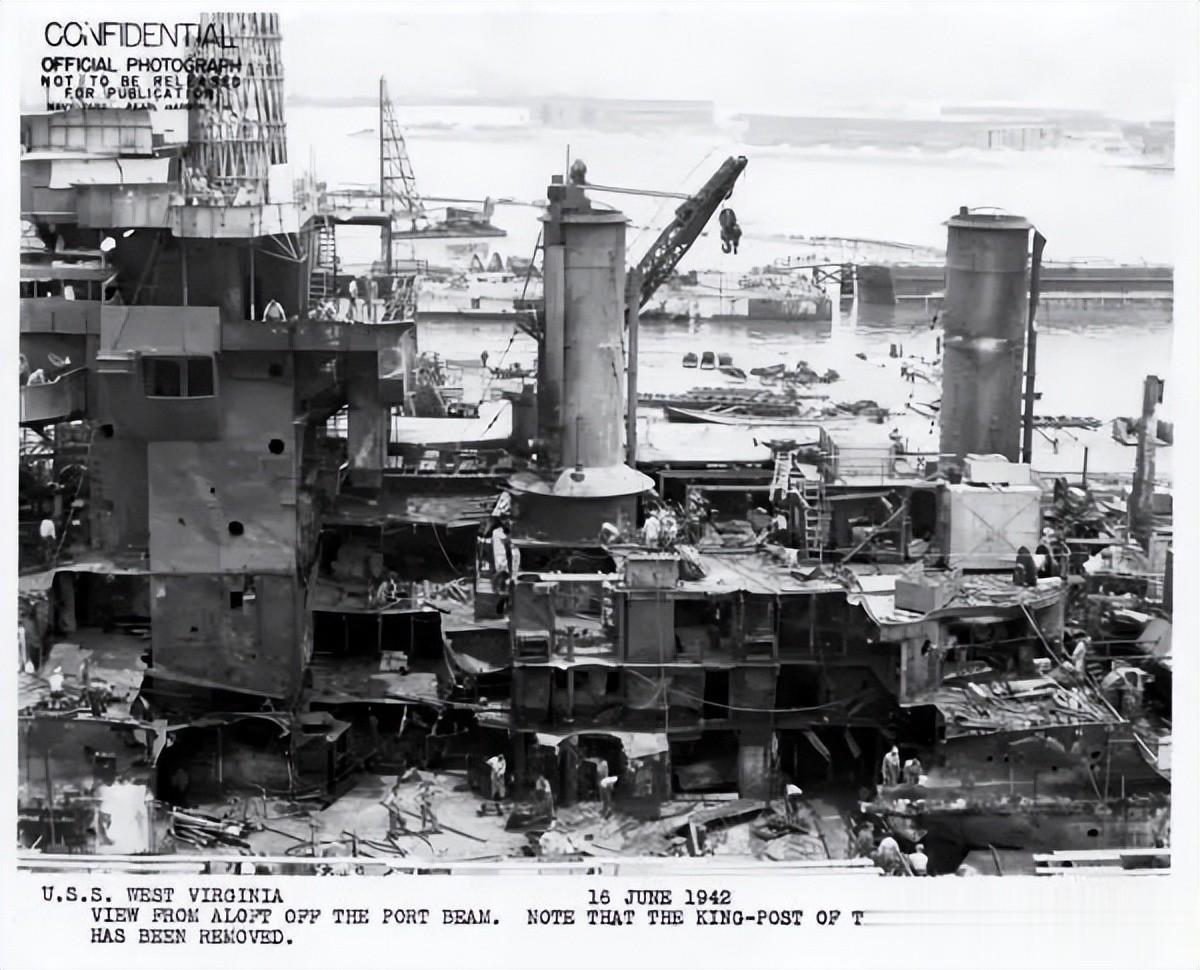 1942年6月西弗吉尼亚号停泊于珍珠港海军造船厂1号干船坞,可见左舷严重损伤: