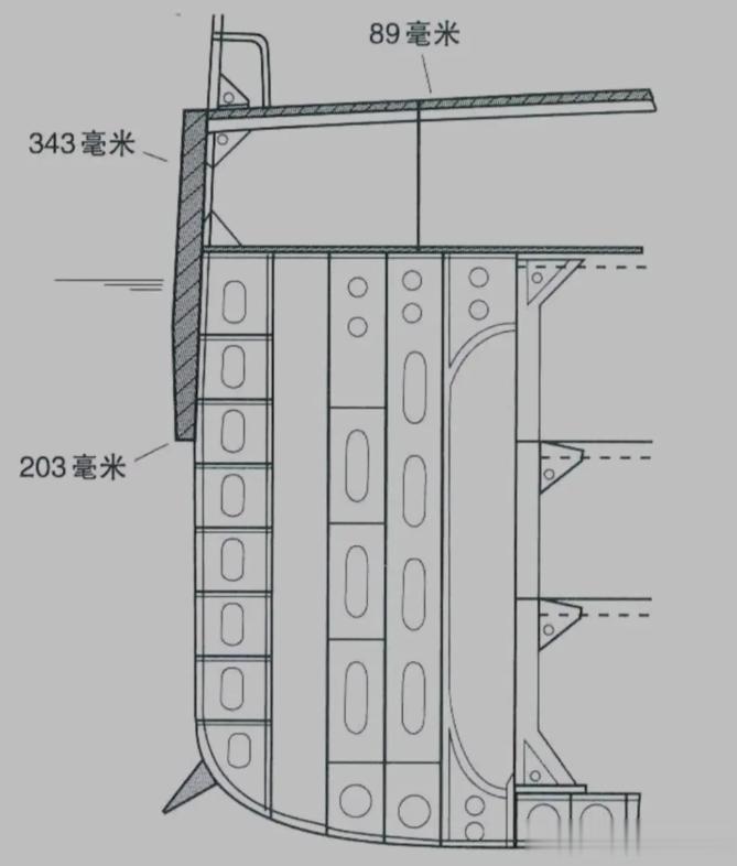 4、装甲防护科罗拉多级防护体系与田纳西级基本相同。水线主装甲带厚度为203-343毫米,覆盖了舰体的机械舱、弹药库等关键部位,说实话这个主装厚度有点不够看,完全防不住16英寸级别的主炮。主装甲带高度约5.5米。