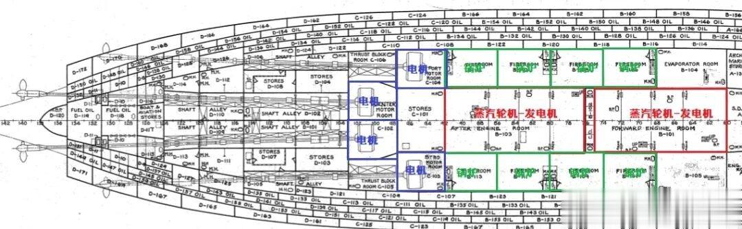5、动力系统科罗拉多级战列舰采用涡轮-电力推进装置,由8台巴布科克-威尔考克斯式燃油锅炉驱动两台蒸汽轮机,再带动发电机驱动电动机,推动四个螺旋桨。推进系统设计功率在27000至28900匹马力之间。