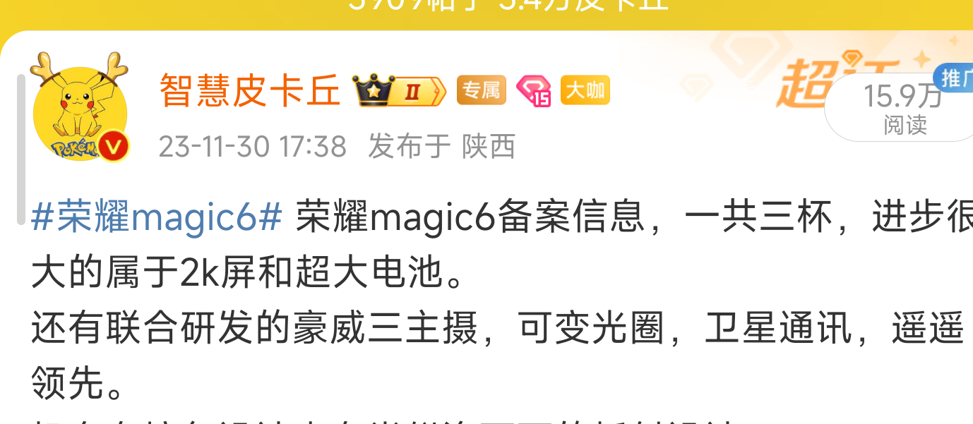 #荣耀magic6# 荣耀magic6系列这次很全面了,低功耗屏幕,青海湖电池,管理芯片,续航很猛。另外居中双挖孔,眼部追踪,手势操作都有升级。