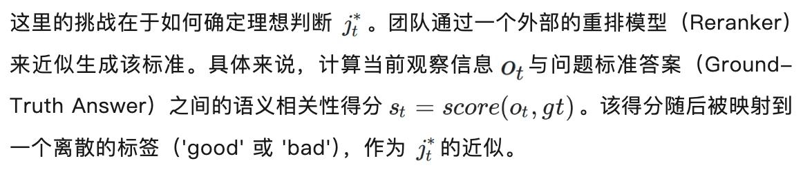 这种奖励塑造(Reward Shaping)策略为智能体提供了密集的、步进式的反馈,引导其逐步学会如何准确评估信息价值,从而使 JUDGE 动作真正有效。