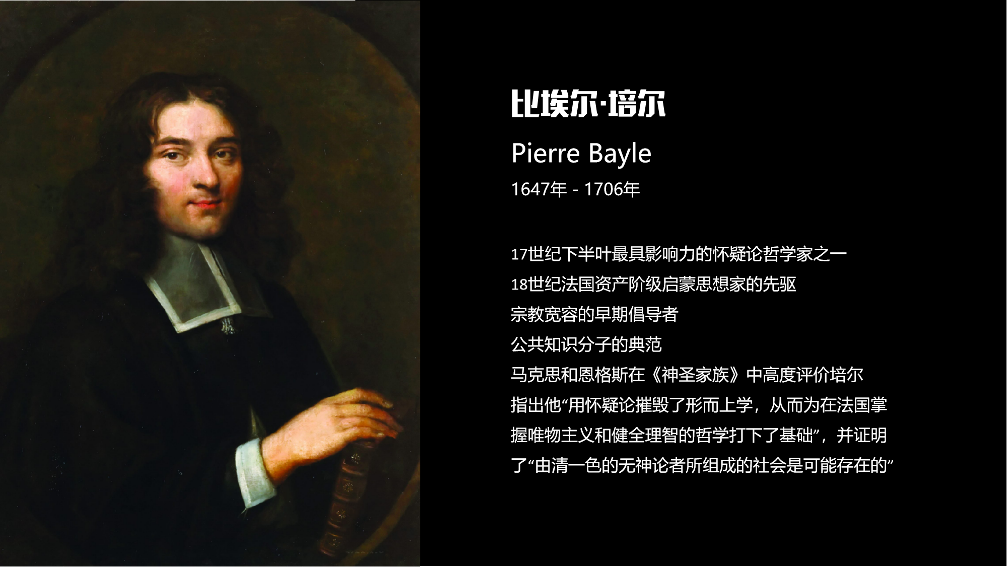 在《历史批判辞典》中,他驳斥了“神正论”与“前定和谐”,质疑莱布尼茨“上帝创造的是所有可能世界中最好的世界”的观点。他质疑道德依赖于宗教信仰的传统观念,认为道德基于理性与良知,无神论者同样可以有高尚道德,甚至可能组成文明社会。他还质疑历史记载和《圣经》叙述的客观性与准确性。强调批判性考证,区分史实与传说,揭露其中错误与偏见。并在1686年出版了《哲学评论》,质疑宗教迫害和教条主义的合法性。倡导宗教宽容和广泛的良心自由,认为信仰不能强制。