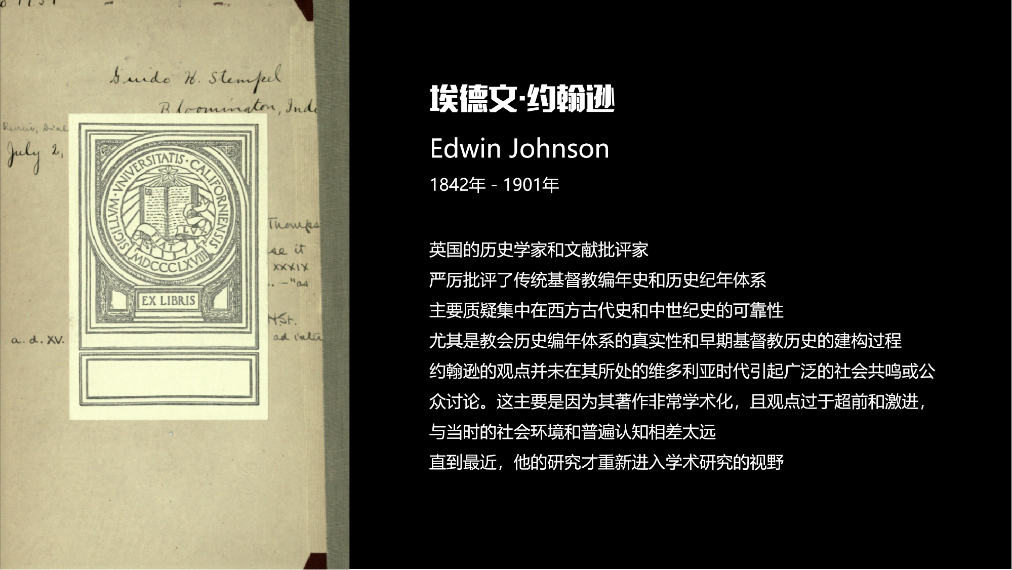 埃德文·约翰逊则采取了更为激进的立场。在其著作《基督教起源》中,约翰逊采用比较神话学方法质疑了早期基督教历史的真实性。1903年,他出版了《西方历史的崛起》,认为现有的古代史和中世纪史编年体系(尤其是教会史)存在大量人为篡改和虚构,许多事件和人物被刻意提前或延后以服务宗教叙事。指出许多被视为“古代”的文献实际是中世纪后期的产物,其年代被故意前推以伪造历史连续性。尽管约翰逊的观点被主流学界视为极端,但他代表了一种彻底怀疑精神:西方宗教和历史传统的核心叙事也需要被解构。