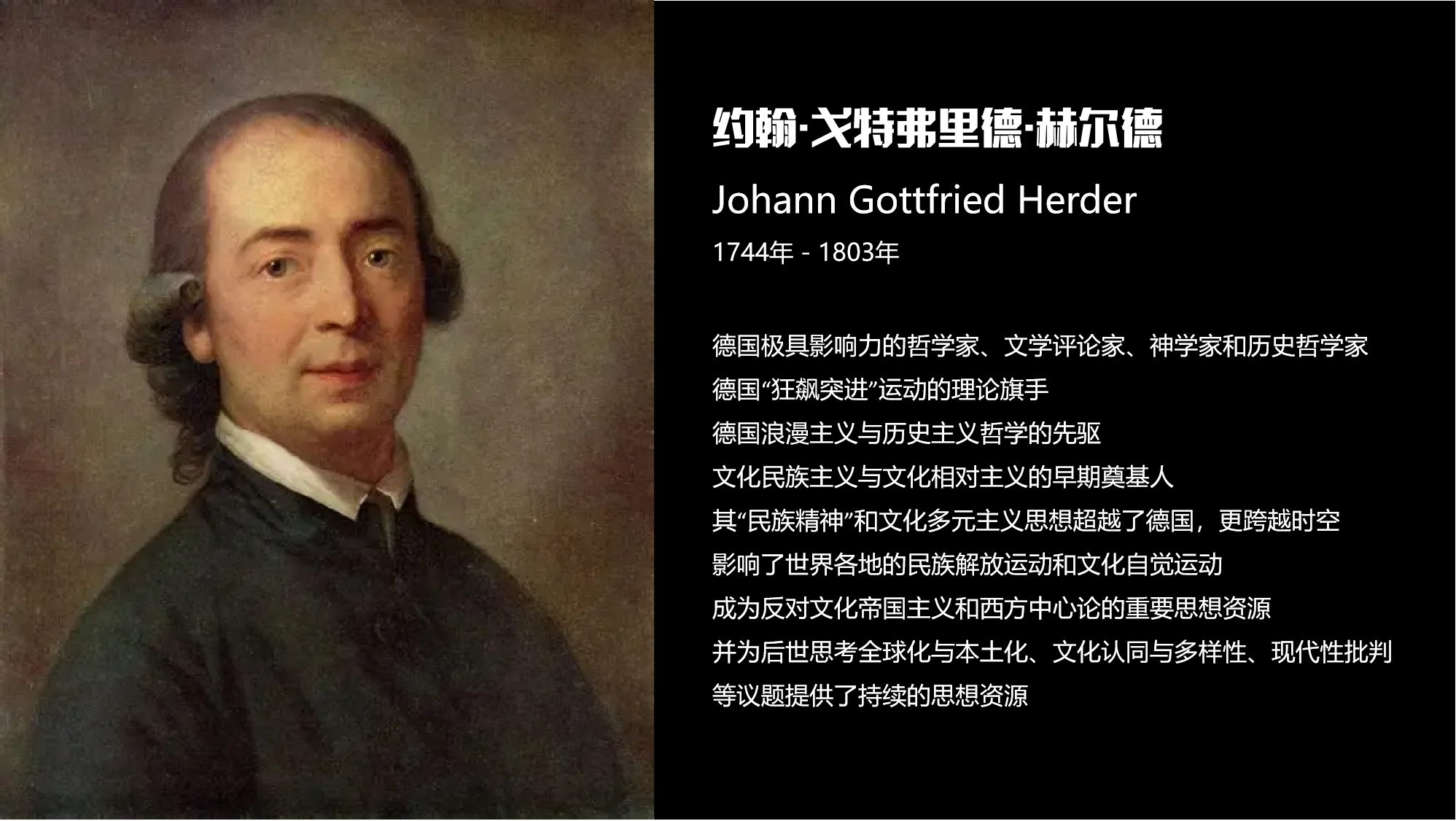 德国极具影响力的哲学家、文学评论家、神学家和历史哲学家,赫尔德,敏锐地质疑了当时在西方(尤其是法国)占主导地位的启蒙普遍主义和欧洲中心论历史观。在《另一种历史哲学》、《人类历史哲学的观念》中,反对将理性(尤其是法国启蒙思想家的抽象理性)视为衡量所有文化的唯一、普世标准,认为这忽视了人类经验的丰富性、历史性和文化多样性。他批判那种将历史视为直线进步、并将欧洲(尤其是法国)文明视为历史顶点的观点。强调不同历史时期和文化都有其内在价值和独特性,不能以“先进/落后”简单评判。