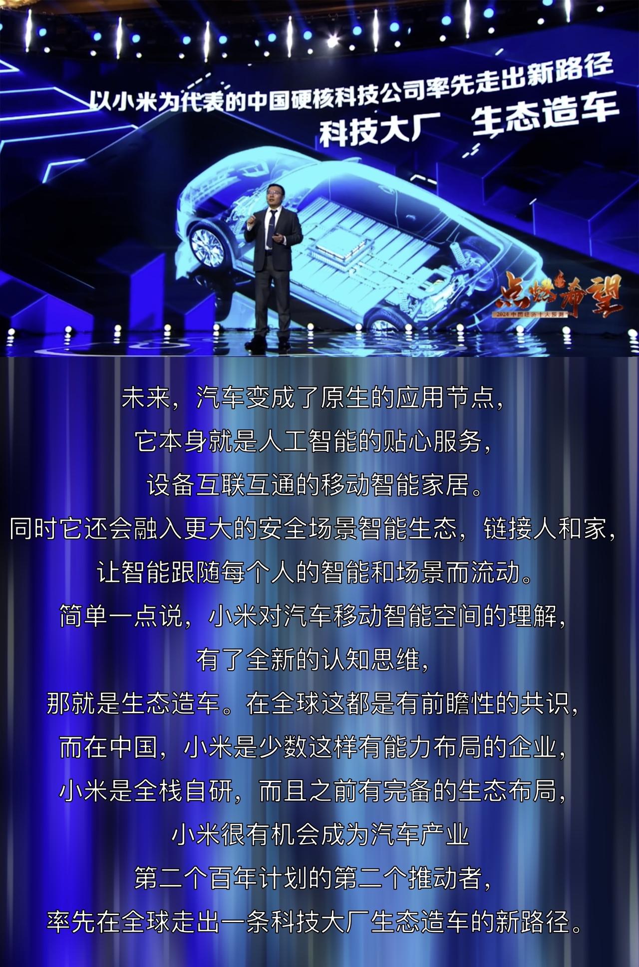 经济学家#任泽平预测小米汽车#成为汽车产业第二个百年进化的新一代推动者。 这个预测是在任泽平年度演讲中作出的。在这次演讲上,任泽平回顾了汽车产业过去一百多年共出现的三次重大产业变革浪潮,第一次是汽车作为“机械载具”代替了马车,诞生了以保时捷、法拉利、奔驰等欧美品牌;第二次是汽车逐渐成为集多功能于一体的大号移动智能终端,以特斯拉、蔚小理、问界为代表;第三次变革正在酝酿中。可见每一次浪潮都催生出杰出的标杆企业,而第三次变革由哪些代表性企业推动呢? 任泽平在接触到小米智能汽车团队后找到了答案。小米对汽车这个“移动智能空间”的理解超出现有汽车企业,堪称全新的认知升维,核心就是“生态造车”。生态造车是将汽车的智能化从插件逻辑升级为生态逻辑,不再单纯拼算力和智能应用数量,而是将汽车变为原生的智能生态节点,以此达到人工智能贴心服务、设备互联互通的移动智能家居,并融入更大的全场景智能生态,即是人车家相互联动的生态造车理念。 从中可以感受到小米造车理念的先进性和前瞻性,也是这种认知升维的生态造车理念让我们对未来汽车充满了期待,智能生态布局完备的小米以全栈自研率先出发,有力推动第三次变革。