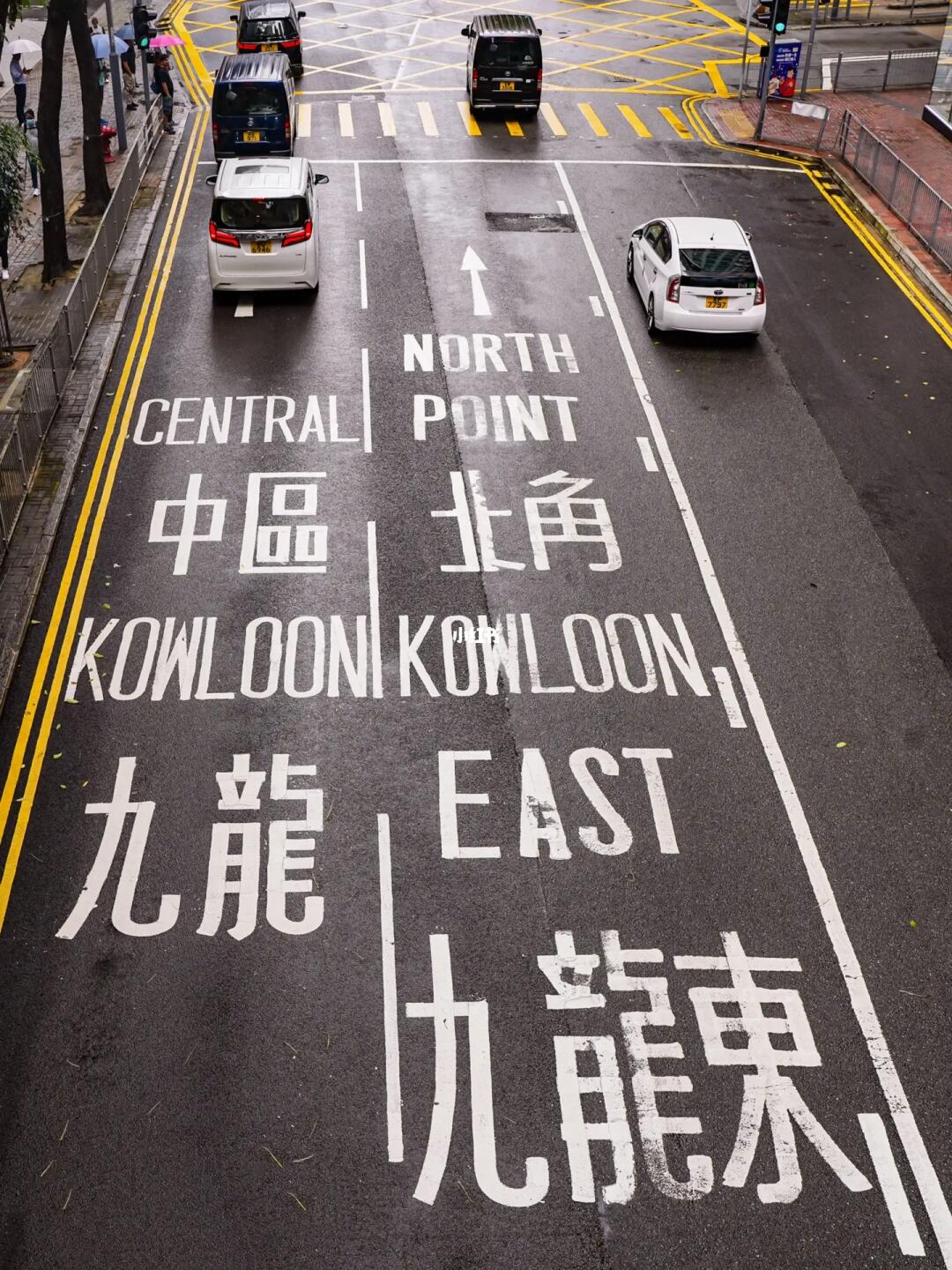 在天桥上俯拍北角文字地标,一辆辆汽车和叮叮车穿过画面,很酷炫