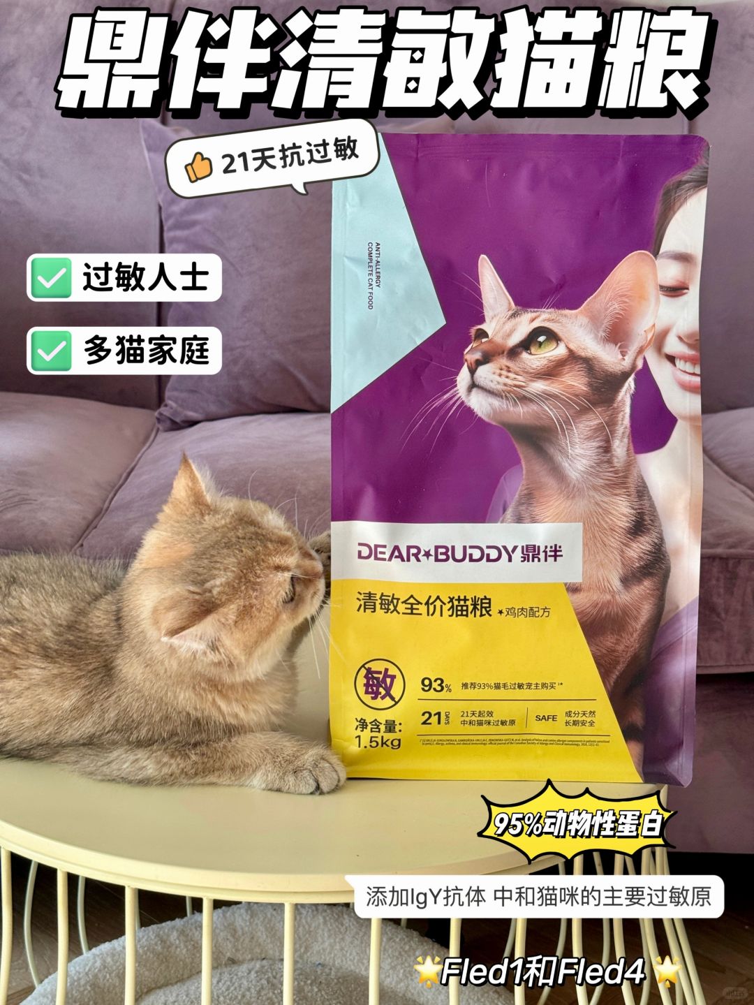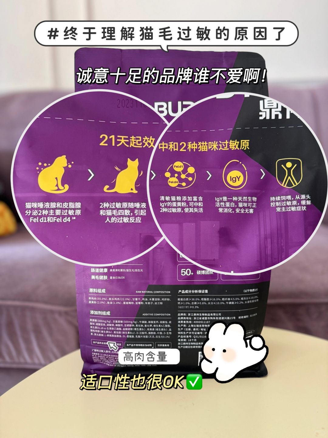 ✨由D-lab鼎伴生命科学中心研发,多位国家级专家打造的猫粮产品,科学配比更加专业,专为过敏性铲屎官进行研发,21天显著降低2种最关键过敏原Fel d 1和Fel d 4的产生。其原理是通过生物技术的方式从鸡蛋黄中提取了特异性IgY,并通过特殊工艺将其添加到猫粮中,猫咪采食后能有效中和2种过敏原,从而缓解铲屎官的过敏症状;lgY是一种天然蛋白质,猫猫可以正常消化,对猫咪友好。另外猫粮内不含任何谷物、人工诱食剂和色素,可以放心食用。