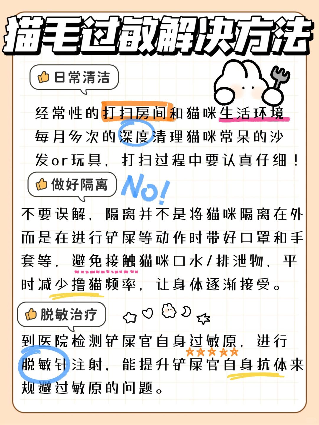 不要误解,隔离并不是将猫咪隔离在外!而是在进行铲屎等动作时带好口罩和手套等,避免接触猫咪口水/排泄物,平时减少撸猫频率,让身体逐渐接受。