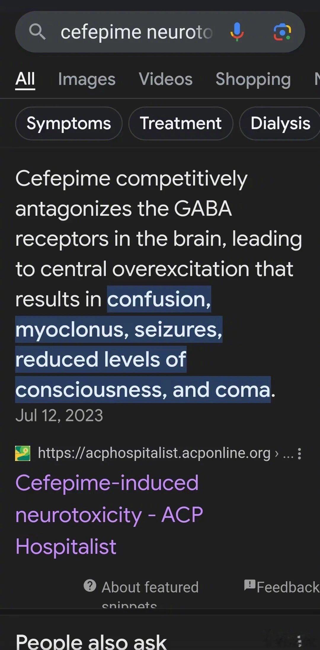 其中的机理就是,头孢吡肟竞争性性拮抗大脑中的GABA受体,导致神经中枢过度兴奋,导致神经中枢出现混乱,病人出现嗜睡甚至神志不清或者昏迷。