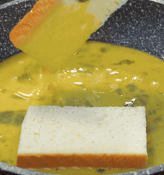 趁着蛋液还没定型,赶紧放面包片。面包片两面都蘸上一层蛋液,这样煎出来外皮金黄,里头嫩。