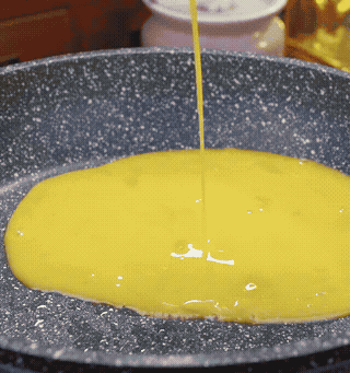 记住,油别太多,少量就行,不然吃着油腻。蛋液一倒下去,马上就凝固了,动作得快。