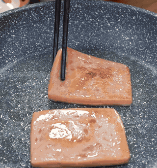 就像这样,两面煎到有点焦边,香味立马飘出来。这里多煎一会儿,午餐肉更Q弹,香味特别浓。锅底有点油,别倒掉,后面用。