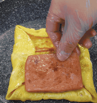 这个手法,对折完鸡蛋皮包着午餐肉和面包片,一口下去,蛋香肉香全都有。外面酥香,里面软嫩,真比外头买的还香。