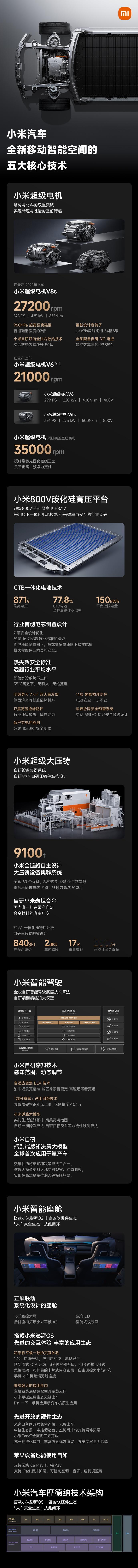 小米汽车技术发布会让人印象深刻的还是最后,小米汽车SU7无人驾驶登上发布会舞台,这已经说明这款车已经具备足够的智能驾驶功能。 当前小米汽车SU7仅有三款配色,永恒经典的雅灰色、个性张扬的海湾蓝、低调内涵的橄榄绿,但是我个人感觉这款汽车不止这两款配色,等到正式发布时还会有新配色。至于外观设计,基本就是这样子了,我个人觉得好看,超跑形态吸人眼球。 小米汽车在技术上基本做到当前较高水准,从雷军介绍来看,拥有小米超级电机、小米800V碳化硅高压平台、小米超大压铸、小米智能驾驶、小米智能座舱等五大核心技术。小米自研了CTB一体化电池技术并自建了电池包工厂。最高已量产27200rpm小米超级电机V8s,依托双向全油冷散热技术和碳纤维激光缠绕工艺,最高在实验室已实现35000rpm超级电机,初入汽车行业就有这样的实力,着实让人佩服,小米汽车的团队都这么猛吗?小米还毫不含糊表示直接对标保时捷和特斯拉,做先进移动智能空间的C级高性能生态科技轿车。 小米进入汽车行业引起行业不小的震动,如今技术发布会一开,小米实车或许已经成功一半了,2024年的汽车市场的竞争将进入白热化。小米立志仅用15-20年的时间,挑战成为全球汽车制造商前五,大家觉得有没有可能?