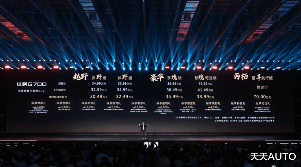 新华AUTO:2025年10月19日,以“至 前所未至”为主题的纵横G700全球上市发布会在安徽芜湖宜居国际博览中心落下帷幕,作为纵横旗下首款量产车型,新车定位“全领域豪华越野SUV”,共推出4个版型,官方指导价为32.99万元—41.49万元,限时超级焕新价30.49万元起,并带来十大上市专属购车权益,旨在为用户提供从购车、用车到玩车的全链路尊享体验。作为纵横首张成绩单,G700的横空出世,正是纵横以技术创新打破边界,以品类创新定义豪华,以场景创新重塑价值的集中体现。而纵横更是以G700的全领域实力,成就中国汽车工业从大变强的新里程碑,引领属于中国、面向全球的豪华越野新时代。