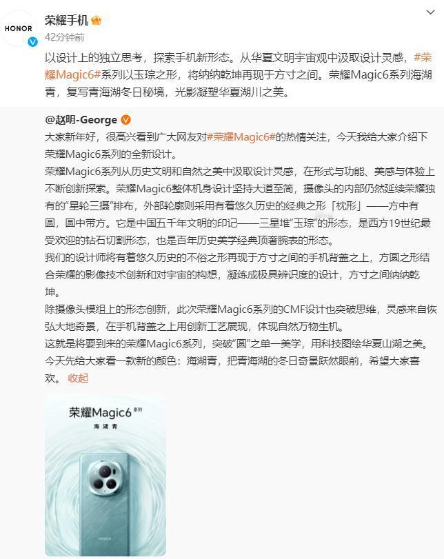 荣耀Magic6系列带来全新配色——海湖青,把青海湖的冬日奇景跃然眼前。更关键的