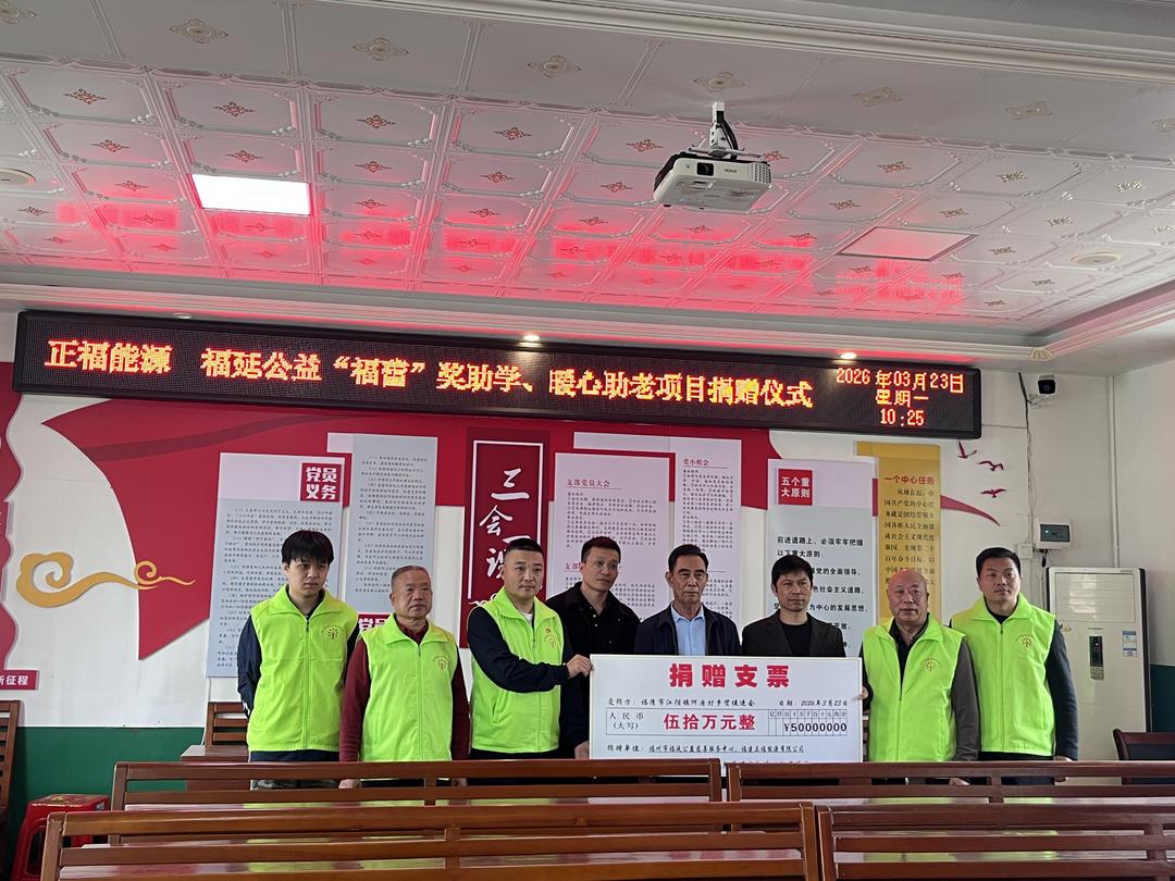 本次活动中,福建正福能源有限公司通过福州市福延公益慈善服务中心,向福清市江阴镇何厝村定向捐赠人民币50万元整,善款全部用于村内公益事业。其中20万元专项用于福延公益“福蕾”奖助学项目,重点奖励何厝村品学兼优学生、资助困难学生,助力乡村教育发展;30万元用于福延公益“暖心”助老项目,支持村内老年人关爱、高龄老人、困难老党员,养老服务等助老事业,切实提升老年群体生活保障。