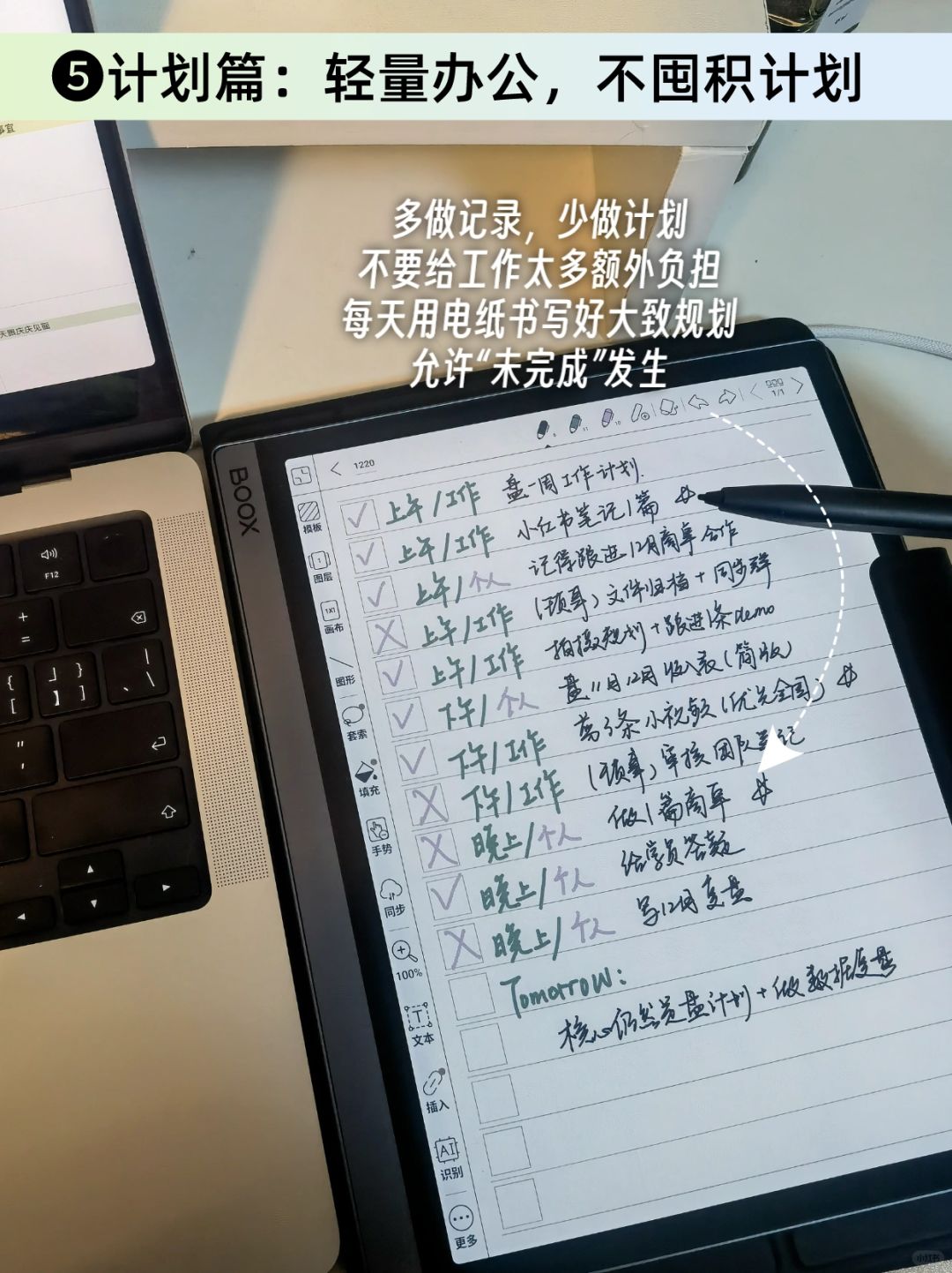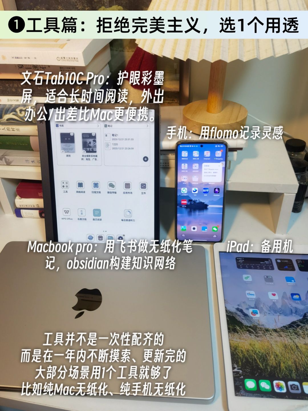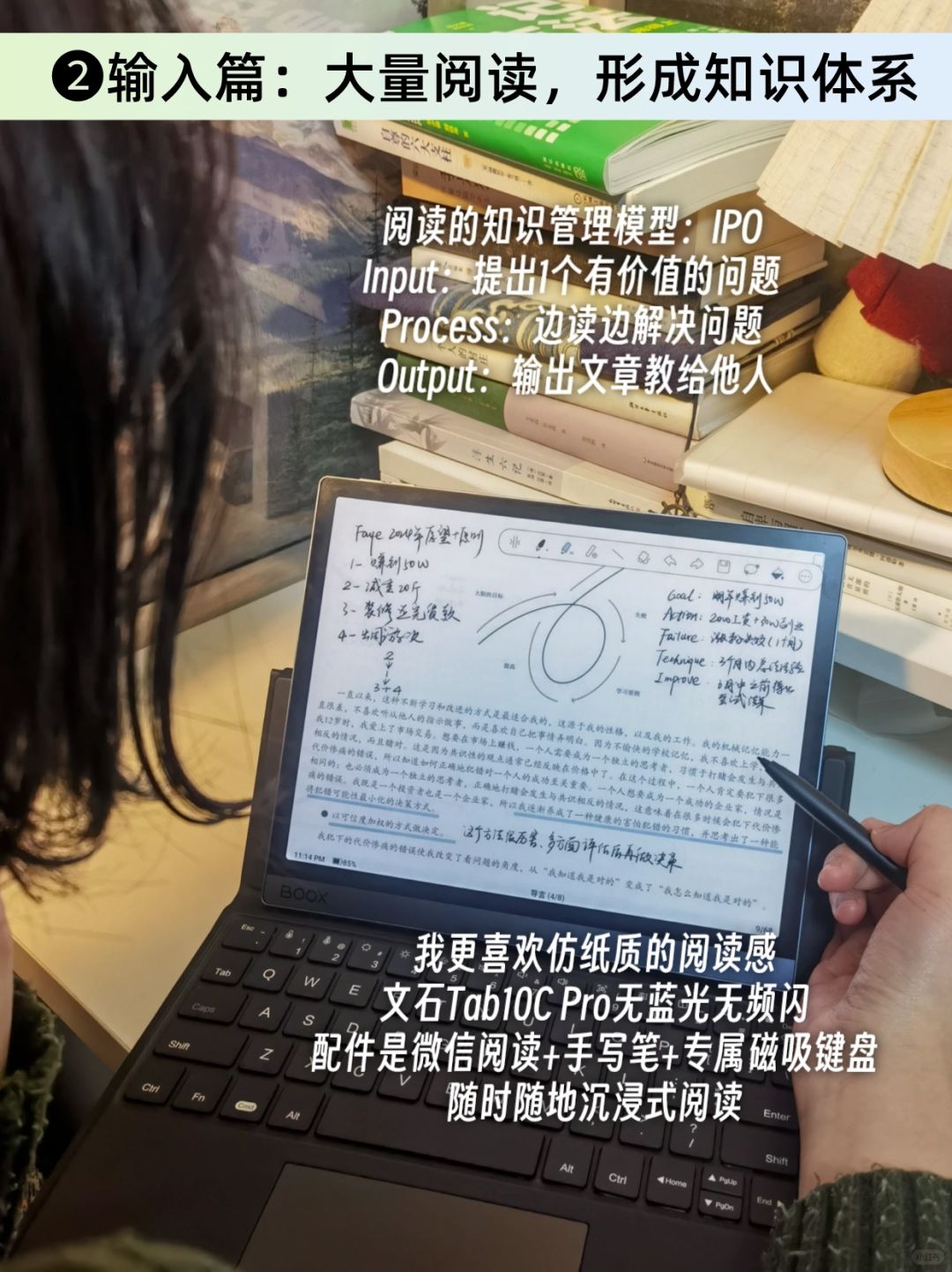 2023年初决定:彻底转到无纸化学习&办公上。 . 年底复盘时,我发现整个人脱胎换骨:主业建立起几十个SOP效率超高,10月升为团队负责人。 下班后输出上百篇文章,写了一门课,副业收入突破六位数。 想要摆脱拖延、懒散、知识囤积、无力解决问题的困境,不妨就从1个小切口下手,下决心改变你的记录方式,用无纸化开启更高效的生活模式。 . 我将这套模型总结成了6个简单、可循环、可重复、复利巨大的步骤: ❶工具篇 选定1个工具,匹配多种场景,尽可能轻量化办公。 比如,我日常出短差+无纸阅读+简单文件处理,用的是文石Tab10C Pro,安卓12开放式系统,日常办公需要的app都能下载。性能强大,运行速度很快,还能自由分屏,边读边写,满足我各类阅读记录需求。 彩色墨水屏大大提高了我的出差办公效率,主要很方便我路途中看各种图表方案,没有蓝光没有频闪,看久也不累眼。文石Tab10C Pro支持快刷,翻页几乎无残影,既保留了墨水屏的护眼同时解决了卡顿刷新的速度问题,大大满足强迫症的心理,阅读体验感直接拉满!打开各类app/行业资讯也不卡,秒打秒开。这款还搭配专属磁吸键盘,贴上就能打字,完全可以当作平板电脑办公用,哪位出差人能不爱呢? Mac多用在出长差+写课程+复杂文件编辑中。 . ❷输入篇 大量阅读,是建立知识体系的基础,阅读直接用这个知识管理模型:IPO Input:提出1个有价值的问题 Process:边读边解决问题 Output:输出文章教给他人 . ❸输出篇 阅读无法直接吸收知识,一定要用自己的语言转化出来。先用文石Tab10C Pro手写记录下转瞬即逝的灵感,然后扫描转化为思维导图,等到有大段时间再扩充成读书笔记,分享在公开平台。 . ❹体系篇 读了很多书,但知识还是零碎的怎么办? 建议用飞书或Obsidian这类软件,将知识点打上标签、链接到文件中,自动形成知识网络。 随着你越写越多,调用得越加频繁,就能自发在脑海里建立起知识体系了。 . ❺计划篇 在无纸化学习中,做计划很重要,但千万不要被计划带着走。我建议是尽量多做记录,不加以评判,观察自己实现计划的能力边界,再做调整。 . ❻复盘篇 有了计划,就一定要有复盘,这是快速迭代的捷径,我的复盘模板也已经放在P9分享给大家了,建议从我的模板开始用起,养成长期复盘的好习惯~