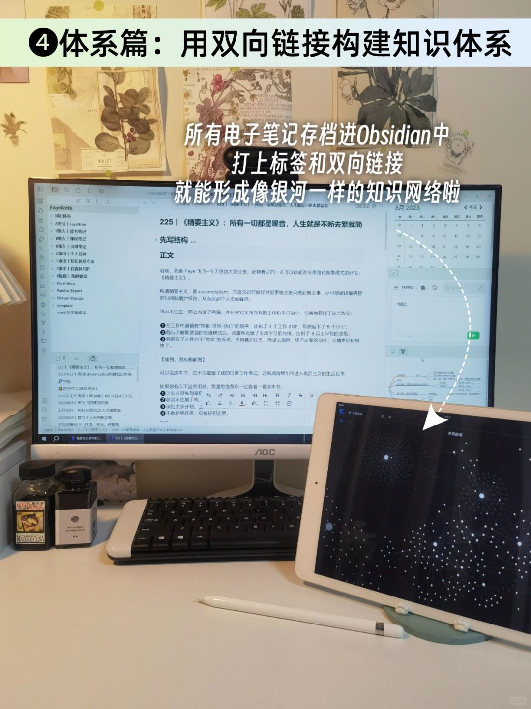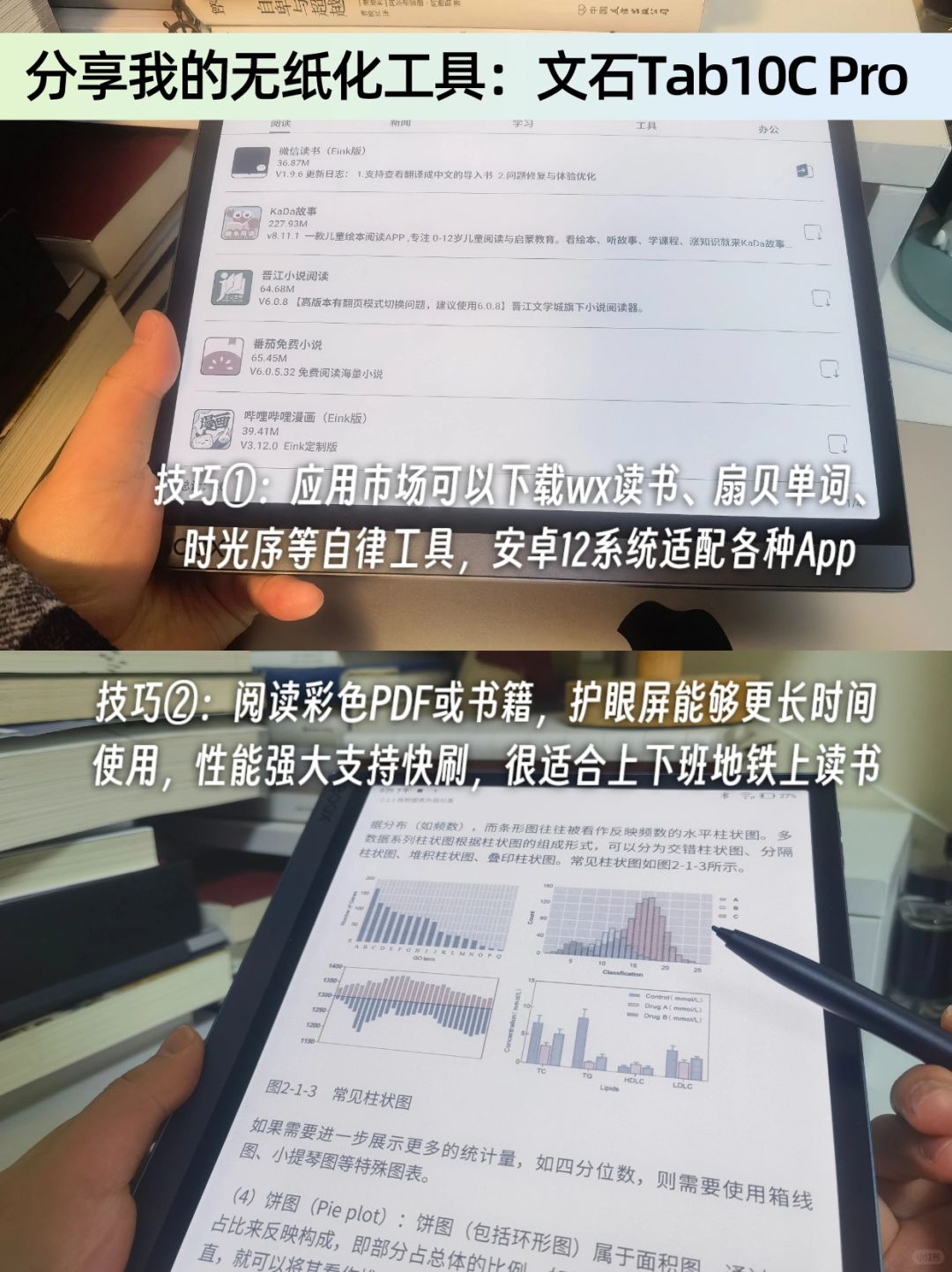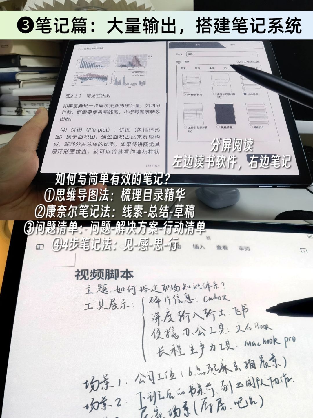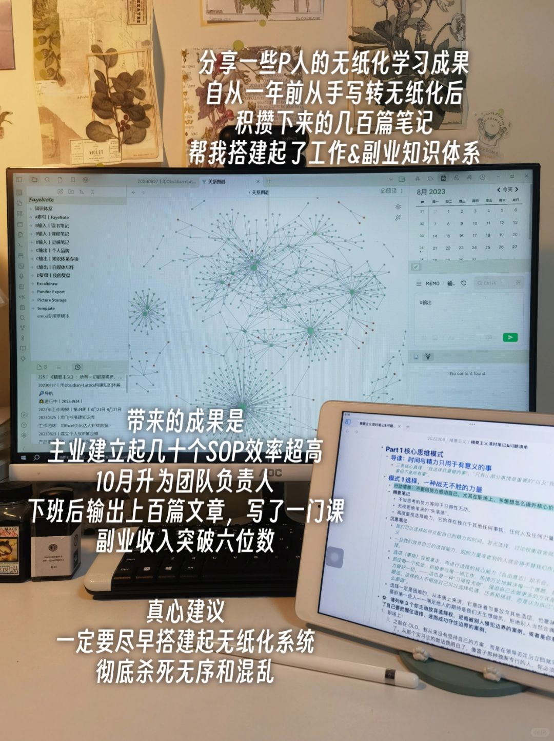 2023年初决定:彻底转到无纸化学习&办公上。 . 年底复盘时,我发现整个人脱胎换骨:主业建立起几十个SOP效率超高,10月升为团队负责人。 下班后输出上百篇文章,写了一门课,副业收入突破六位数。 想要摆脱拖延、懒散、知识囤积、无力解决问题的困境,不妨就从1个小切口下手,下决心改变你的记录方式,用无纸化开启更高效的生活模式。 . 我将这套模型总结成了6个简单、可循环、可重复、复利巨大的步骤: ❶工具篇 选定1个工具,匹配多种场景,尽可能轻量化办公。 比如,我日常出短差+无纸阅读+简单文件处理,用的是文石Tab10C Pro,安卓12开放式系统,日常办公需要的app都能下载。性能强大,运行速度很快,还能自由分屏,边读边写,满足我各类阅读记录需求。 彩色墨水屏大大提高了我的出差办公效率,主要很方便我路途中看各种图表方案,没有蓝光没有频闪,看久也不累眼。文石Tab10C Pro支持快刷,翻页几乎无残影,既保留了墨水屏的护眼同时解决了卡顿刷新的速度问题,大大满足强迫症的心理,阅读体验感直接拉满!打开各类app/行业资讯也不卡,秒打秒开。这款还搭配专属磁吸键盘,贴上就能打字,完全可以当作平板电脑办公用,哪位出差人能不爱呢? Mac多用在出长差+写课程+复杂文件编辑中。 . ❷输入篇 大量阅读,是建立知识体系的基础,阅读直接用这个知识管理模型:IPO Input:提出1个有价值的问题 Process:边读边解决问题 Output:输出文章教给他人 . ❸输出篇 阅读无法直接吸收知识,一定要用自己的语言转化出来。先用文石Tab10C Pro手写记录下转瞬即逝的灵感,然后扫描转化为思维导图,等到有大段时间再扩充成读书笔记,分享在公开平台。 . ❹体系篇 读了很多书,但知识还是零碎的怎么办? 建议用飞书或Obsidian这类软件,将知识点打上标签、链接到文件中,自动形成知识网络。 随着你越写越多,调用得越加频繁,就能自发在脑海里建立起知识体系了。 . ❺计划篇 在无纸化学习中,做计划很重要,但千万不要被计划带着走。我建议是尽量多做记录,不加以评判,观察自己实现计划的能力边界,再做调整。 . ❻复盘篇 有了计划,就一定要有复盘,这是快速迭代的捷径,我的复盘模板也已经放在P9分享给大家了,建议从我的模板开始用起,养成长期复盘的好习惯~