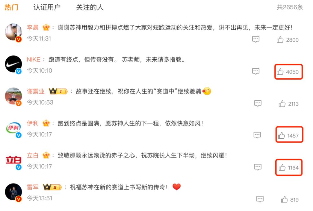 纵观“苏神”退役微博的2600多条评论中,NIKE、伊利、立白、小米等品牌的致敬文案赚足好感,且有三条品牌文案冲进评论区热度榜TOP5。截至发稿,耐克的文案更是以4050点赞量拿下第一。