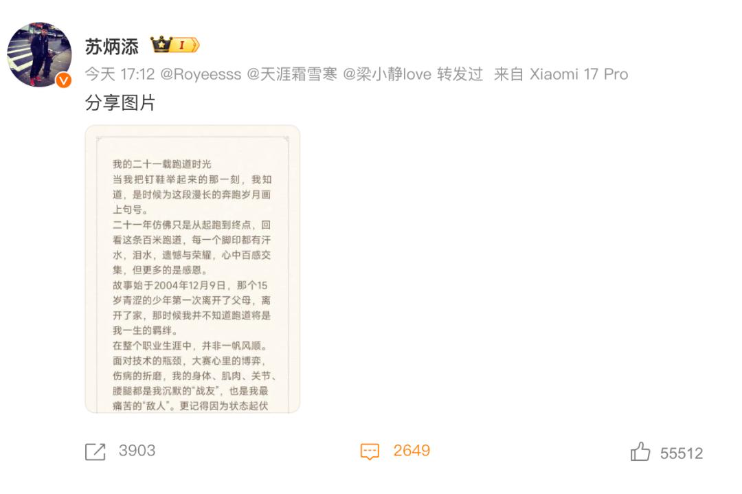苏炳添退役长文,向下滑动查看,图源苏炳添微博