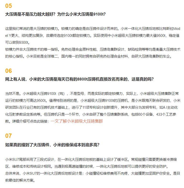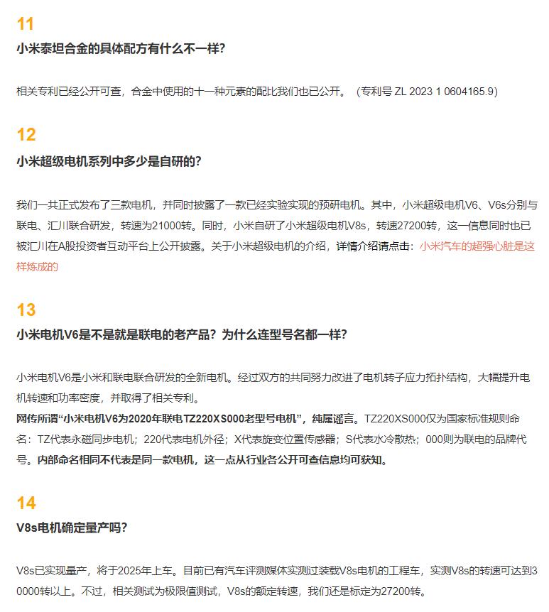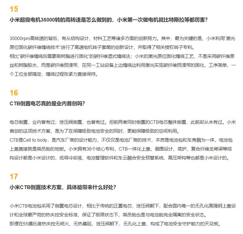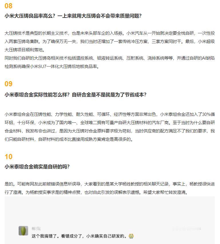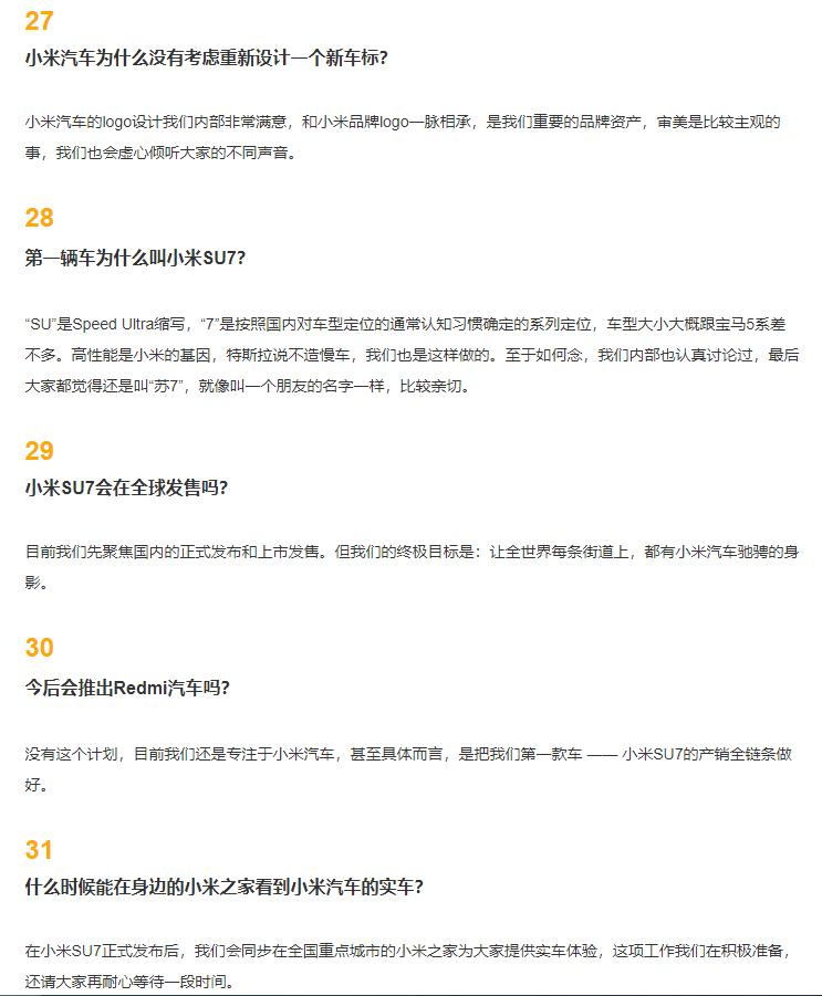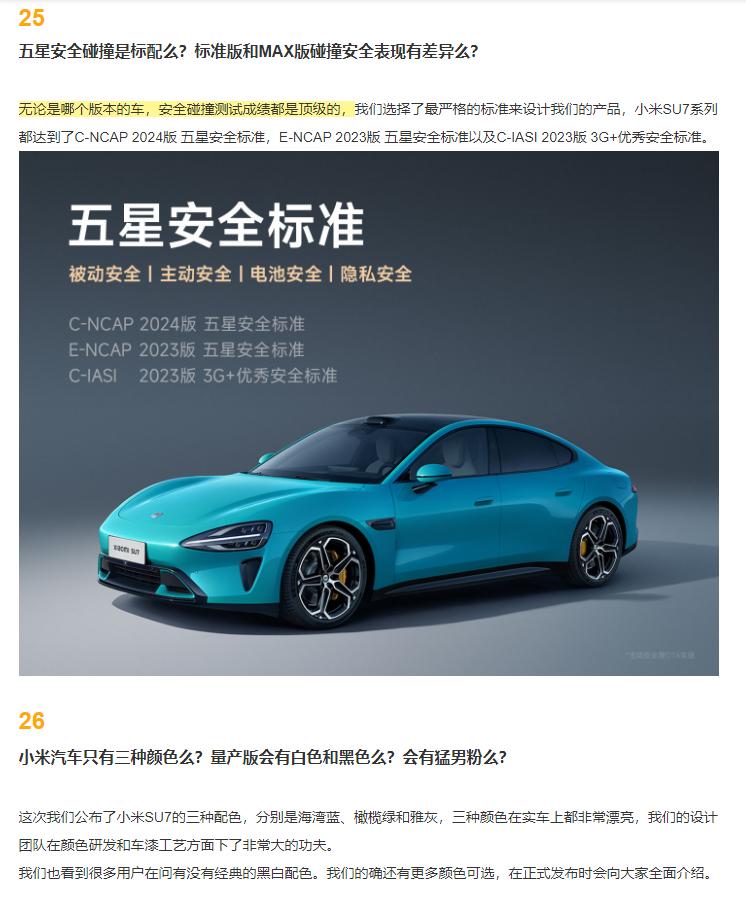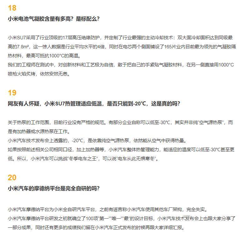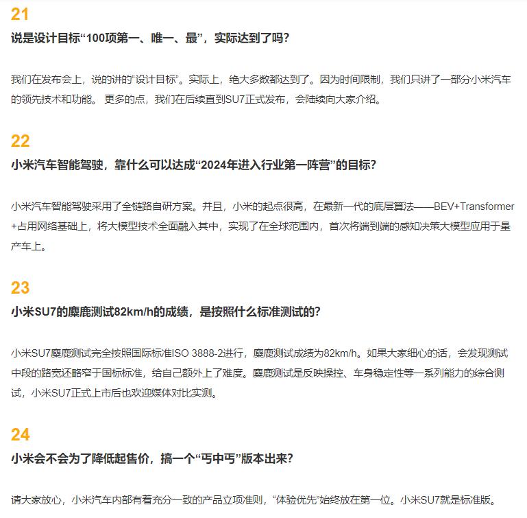 没想到小米汽车官方还回答这样的问题——很多米粉反馈,最近关于小米汽车的谣言这么多,小米法务真的有干活么?何时公布下相关进展? 针对这个问题,小米汽车官方表示会及时澄清谣言,也会追究恶意抹黑者的法律责任,就这点来说,这太应该了,能够更好地解决部分谣言抹黑扰乱视听问题。 这样的问题,小米汽车整理了100个,分为三期进行回答,从中可以看到关心小米汽车的消费者心中的大多数疑问。想真正了解小米汽车的消费者,只需要看这100个问题,不需要去那些没法辨别真假的消息。在这100问中,小米汽车再次澄清价格不可能低于19.9万元,所以以低价格降低消费者预期的消息或是在捧杀小米汽车,因为这个样的价格小米SU7完全做不到,不然得亏本。所以想知道售价的,就安心等到小米SU7正式发布那一天吧,雷总会宣布一个不会低得太假,但是看了就想买的价格。 还是那句话,想了解小米汽车,就看看内容十分丰富的《小米汽车答网友100问》吧。