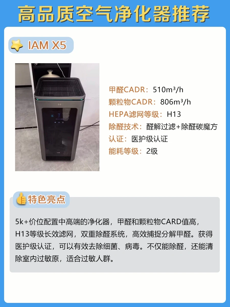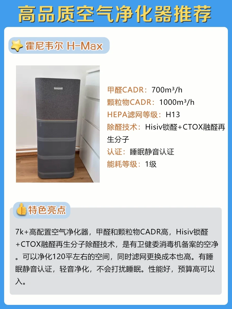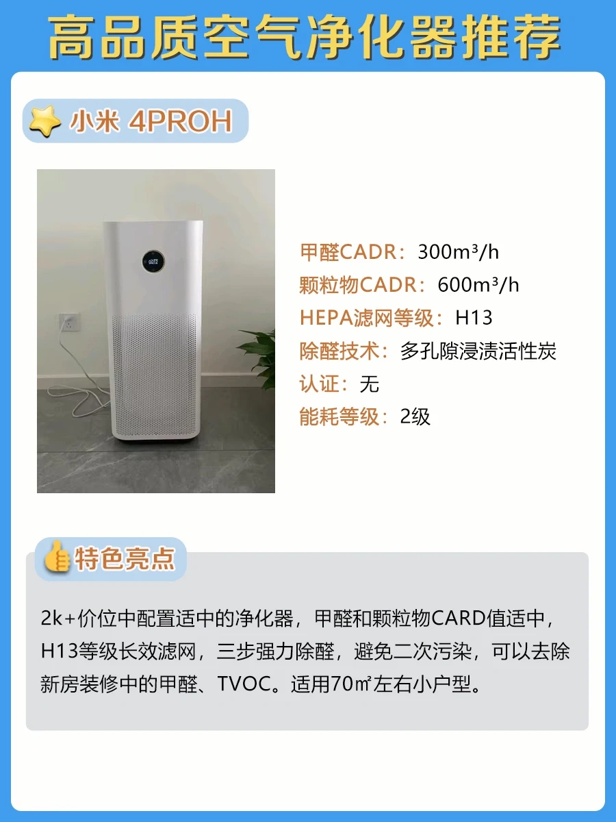 这款是2k+低价高配的空气净化器,甲醛和颗粒物CADR都很高,适用净化面积达120平米,配备H13等级的HEPA滤网,固化分解除醛+醛溶解分子筛双重分解除醛,无二次污染。紫外光能堡垒,全链路消杀。有母婴级认证、护理级认证、除过敏原认证、睡眠级认证4项家电院认证,对比市面上中高端空净一点不逊色,而且是一级能效,使用成本低,性价比超高的。