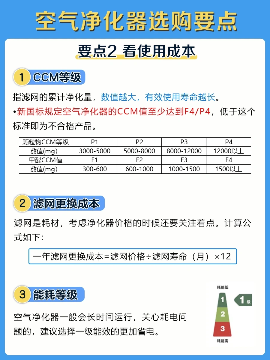 1️⃣CCM数值越大,有效使用寿命越长。新国标规定空气净化器的CCM值至少达到F4/P4