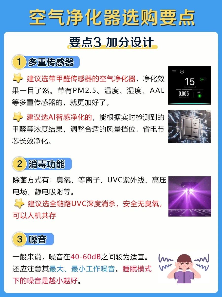 1️⃣选带甲醛传感器的空气净化器,净化效果一目了然。带有PM2.5、温度、湿度、AAL等多重传感器的,就更加好了