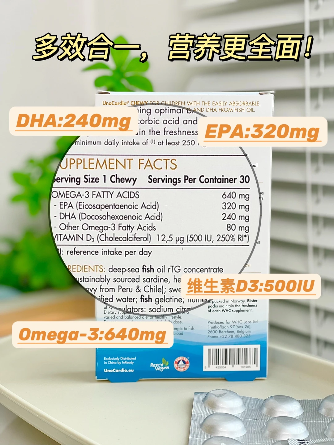 每一颗鱼油Omega-3含量高达640mg,搭载先进的rTG结构,利用率更高,更容易被人体吸收,对宝宝眼脑发育都很好。DHA+EPA+维生素D3同补,每天一颗营养满满,助益孩子健康成长,眼、脑。