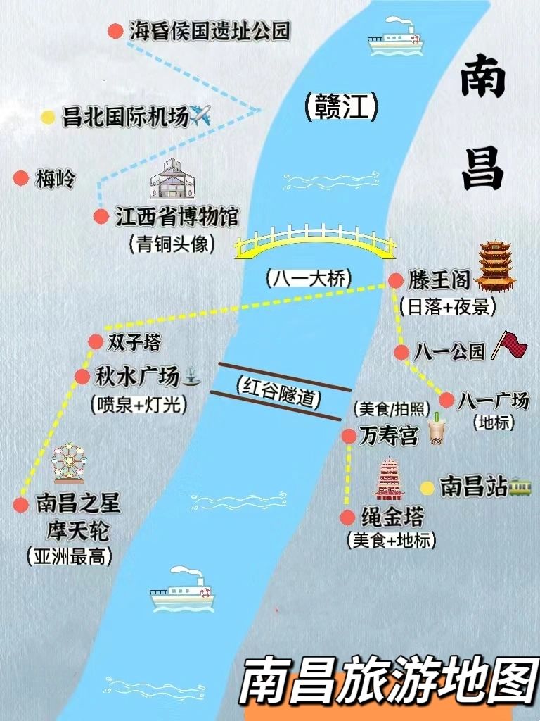 路线:绳金塔——>珠宝街——>万寿宫——>江西美术馆——>八一纪念——>佑民寺——>滕王阁