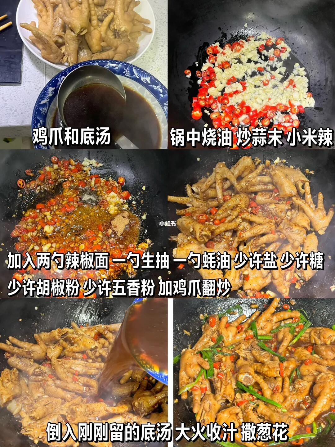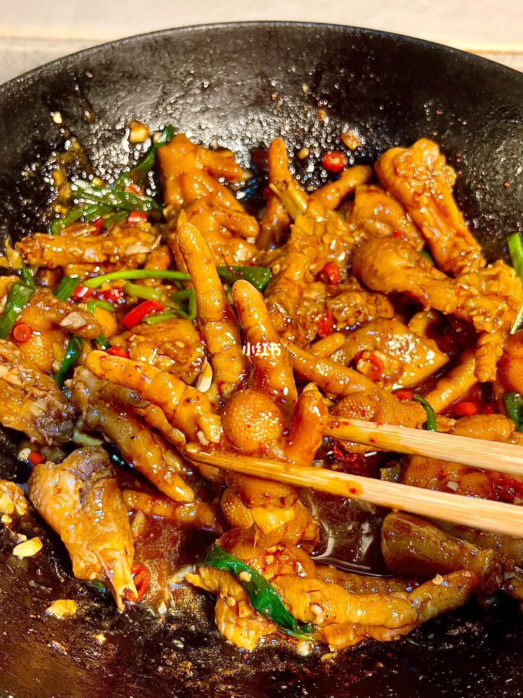3️⃣时间到了捞出鸡爪,留一碗汤汁,另起锅烧油,放入小米辣、蒜末炒香