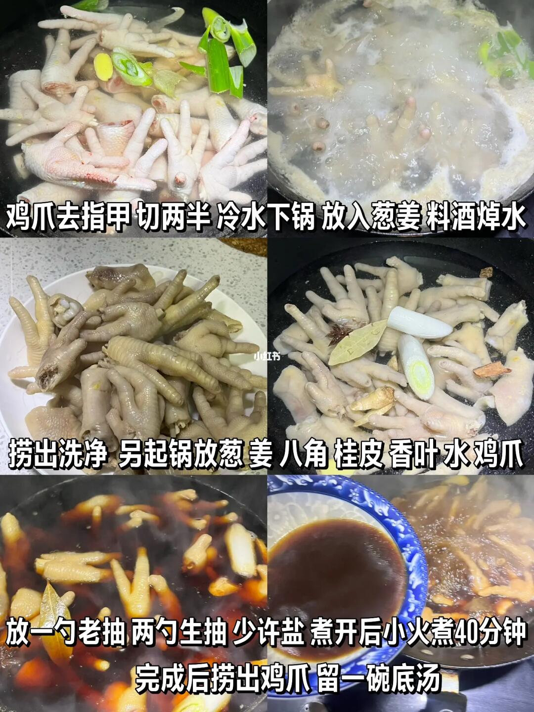 2️⃣锅中加水,放入洗净的鸡爪,放葱、姜、八角、香叶、桂皮、一勺老抽、两勺生抽、少许盐,大火煮开后转小火炖煮40分钟