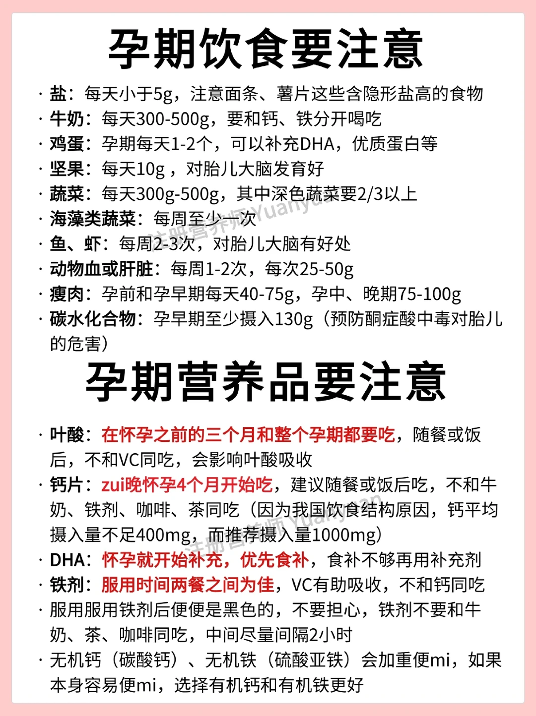 ⚠️注意:叶酸不要和VC同时服用,会影响吸收;DHA补充剂,随餐或饭后效果更佳;钙剂和铁剂不要同时服用,至少间隔两小时。