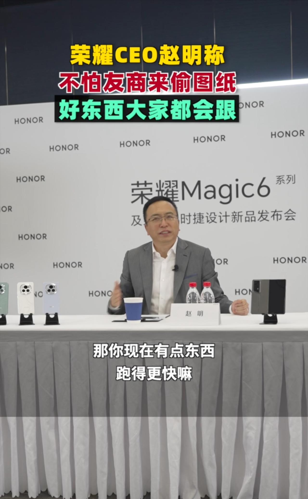这是相当自信——#荣耀赵明称不怕友商来偷图纸# 荣耀Magic数字系列旗舰的最新作——荣耀Magic 6系列于1月11日正式发布。发布会后,荣耀终端有限公司CEO赵明接受媒体采访时说:“对于友商跟进的行为,最好的防守,源自于根植内心对创新的渴望和奔跑的速度,当荣耀跑得更快时,对方所参考和学习的技术就是旧的了。”,并且表示好的东西大家都会跟进,但荣耀不怕友商“偷图纸”、自己跑得足够快就不怕被跟进。 荣耀赵明是相当自信,但也不奇怪,这款手机既拥有科技时尚美学,也兼具众多技术创新突破,其中在通信、续航、屏幕、玻璃、影像、AI等维度以六大引领性创新技术领跑行业。实力藏不住啊!