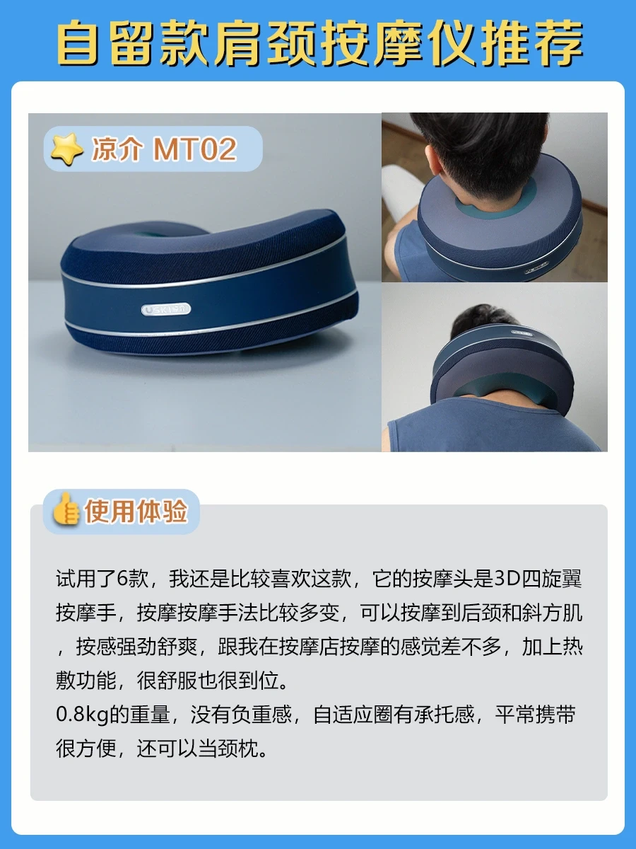 👉🏻试用了这6款肩颈按摩仪,我还是比较喜欢凉介MT02,它的按摩头是3D四旋翼按摩手,按摩按摩手法比较多变,可以按摩到后颈和斜方肌,按感强劲舒爽,跟我在按摩店按摩的感觉差不多,加上热敷功能,很舒服也很到位。0.8kg的重量,没有负重感,自适应圈有承托感,平常携带很方便,还可以当颈枕。