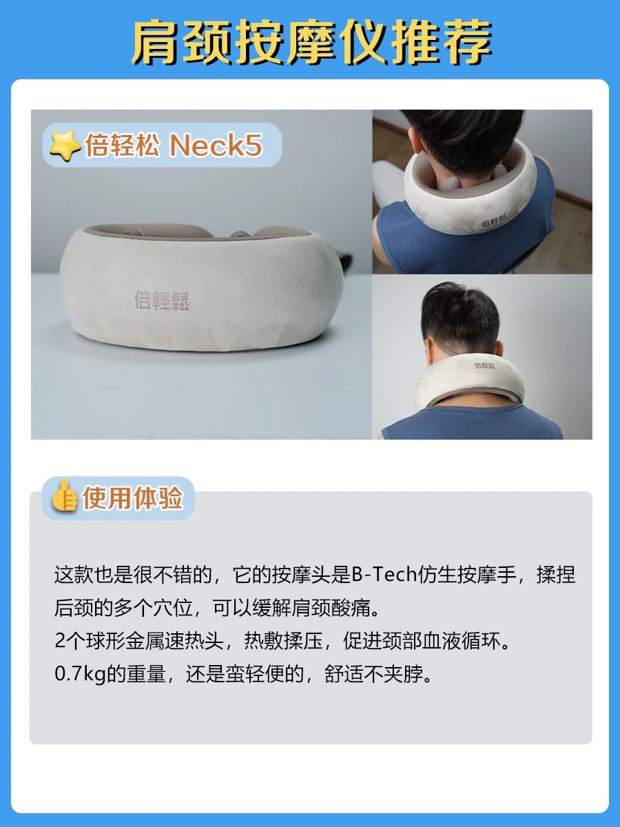 👉🏻倍轻松 Neck5也是很不错的,它的按摩头是B-Tech仿生按摩手,揉捏后颈的多个穴位,可以缓解肩颈酸痛。2个球形金属速热头,热敷揉压,促进颈部血液循环。0.7kg的重量,还是蛮轻便的,舒适不夹脖。